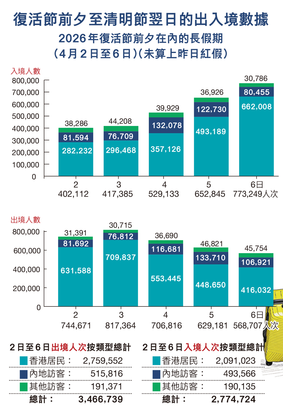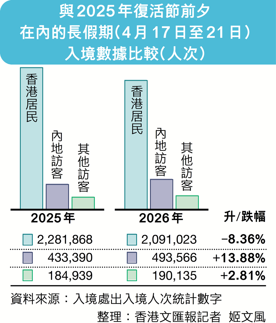 復活節長假期昨日結束,截至晚上9時,香港特區政府入境處共錄得約99.6萬人次出入境;當中入境旅客接近69萬人次,出境超過30.7萬人次。而由4月2日至6日,累計共有逾49萬名內地旅客及逾19萬名其他地區訪客入境香港,兩者分別按年增13.88%及2.81%。海內外旅客的訪港模式漸轉變,各類展覽成為旅客行程重點之一,昨日煞科的香港國際試食節暨優質食品博覽就湧現不少旅客嘗鮮。有深圳旅客表示,香港幾乎每月都舉辦不同類型、各具特色的展覽活動,是香港極具吸引力的旅遊特色。另有東莞旅客被展區內的長洲美食文化區深深吸引,並計劃下月底再次訪港,親身體驗長洲太平清醮的節慶氣氛。●香港文匯報記者 吳健怡