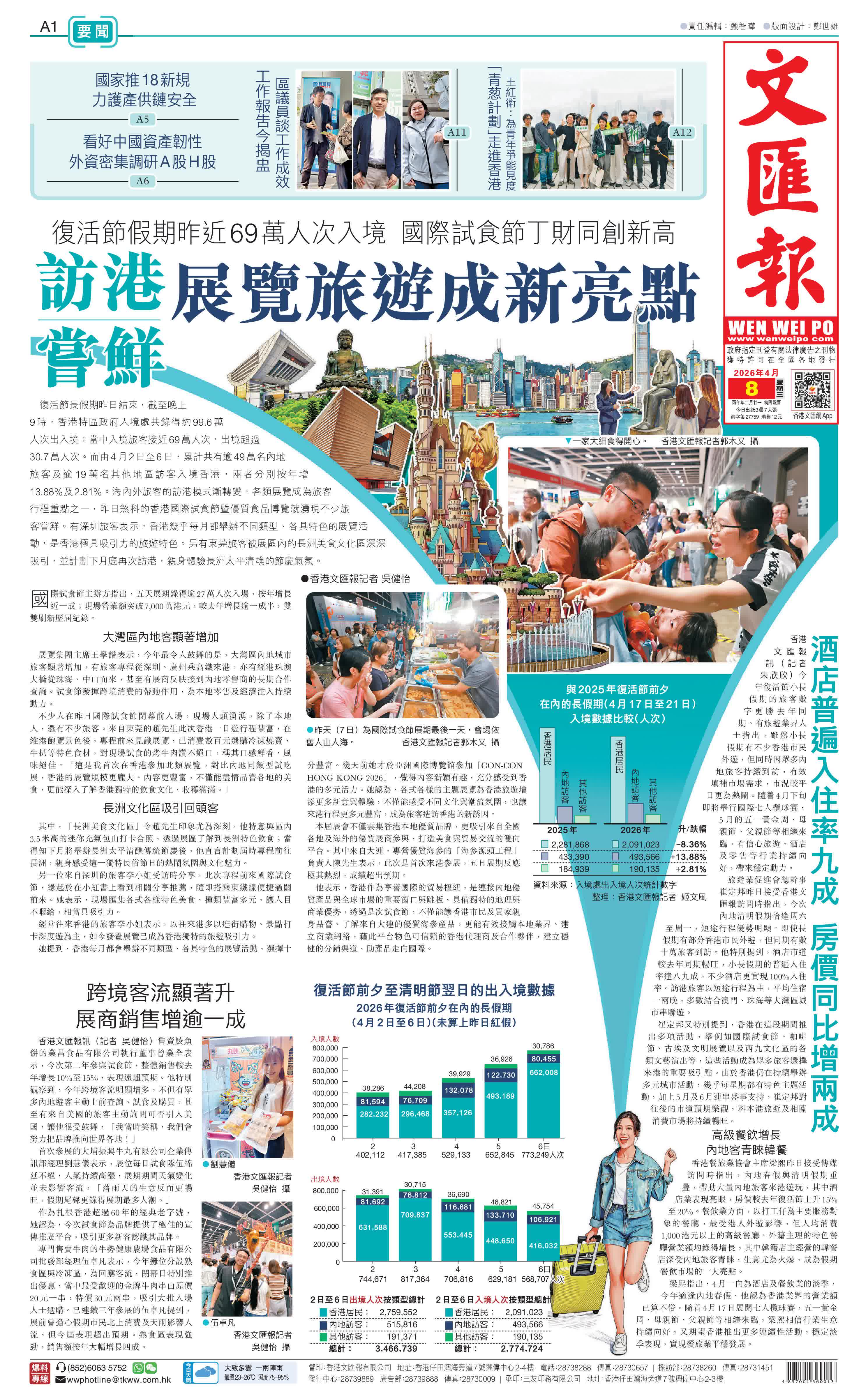 (香港文匯報記者 吳健怡)復活節長假期昨日結束,截至晚上9時,香港特區政府入境處共錄得約99.6萬人次出入境;當中入境旅客接近69萬人次,出境超過30.7萬人次。而由4月2日至6日,累計共有逾49萬名內地旅客及逾19萬名其他地區訪客入境香港,兩者分別按年增13.88%及2.81%。海內外旅客的訪港模式漸轉變,各類展覽成為旅客行程重點之一,昨日煞科的香港國際試食節暨優質食品博覽就湧現不少旅客嘗鮮。有深圳旅客表示,香港幾乎每月都舉辦不同類型、各具特色的展覽活動,是香港極具吸引力的旅遊特色。另有東莞旅客被展區內的長洲美食文化區深深吸引,並計劃下月底再次訪港,親身體驗長洲太平清醮的節慶氣氛。