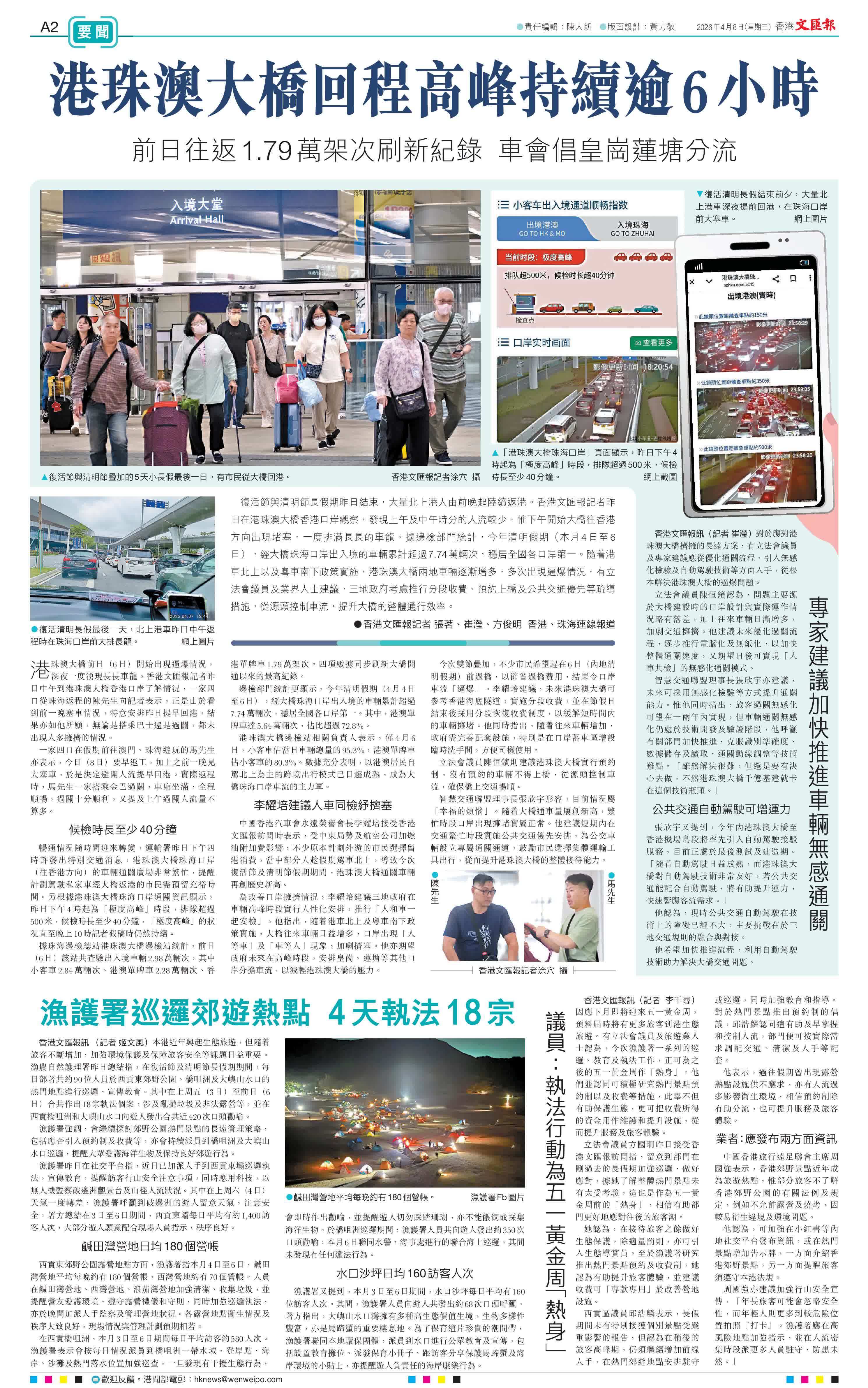 (香港文匯報記者 張茗、崔瀅、方俊明 香港、珠海連線報道)復活節與清明節長假期昨日結束,大量北上港人由前晚起陸續返港。香港文匯報記者昨日在港珠澳大橋香港口岸觀察,發現上午及中午時分的人流較少,惟下午開始大橋往香港方向出現堵塞,一度排滿長長的車龍。據邊檢部門統計,今年清明假期(本月4日至6日),經大橋珠海口岸出入境的車輛累計超過7.74萬輛次,穩居全國各口岸第一。隨着港車北上以及粵車南下政策實施,港珠澳大橋兩地車輛逐漸增多,多次出現逼爆情況,有立法會議員及業界人士建議,三地政府考慮推行分段收費、預約上橋及公共交通優先等疏導措施,從源頭控制車流,提升大橋的整體通行效率。