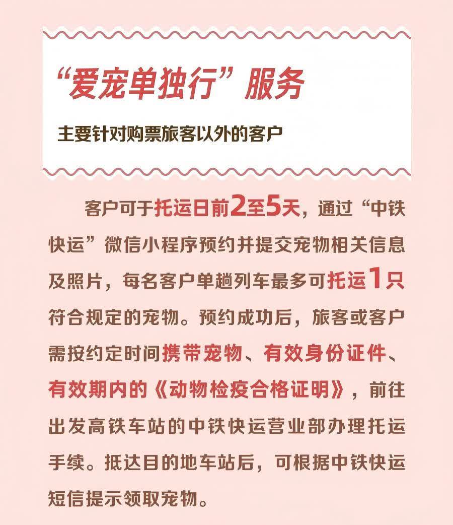 「愛寵單獨行」主要針對購票旅客以外的客戶,客戶可於託運日前2至5天,通過「中鐵快運」微信小程序預約並提交寵物相關信息及照片,每名客戶單趟列車最多可託運1只符合規定的寵物。預約成功後,旅客或客戶需按約定時間攜帶寵物、有效身份證件、有效期內的《動物檢疫合格證明》,前往出發高鐵站的中鐵快運營業部辦理託運手續。抵達目的地車站後,可根據中鐵快運短訊提示領取寵物。
