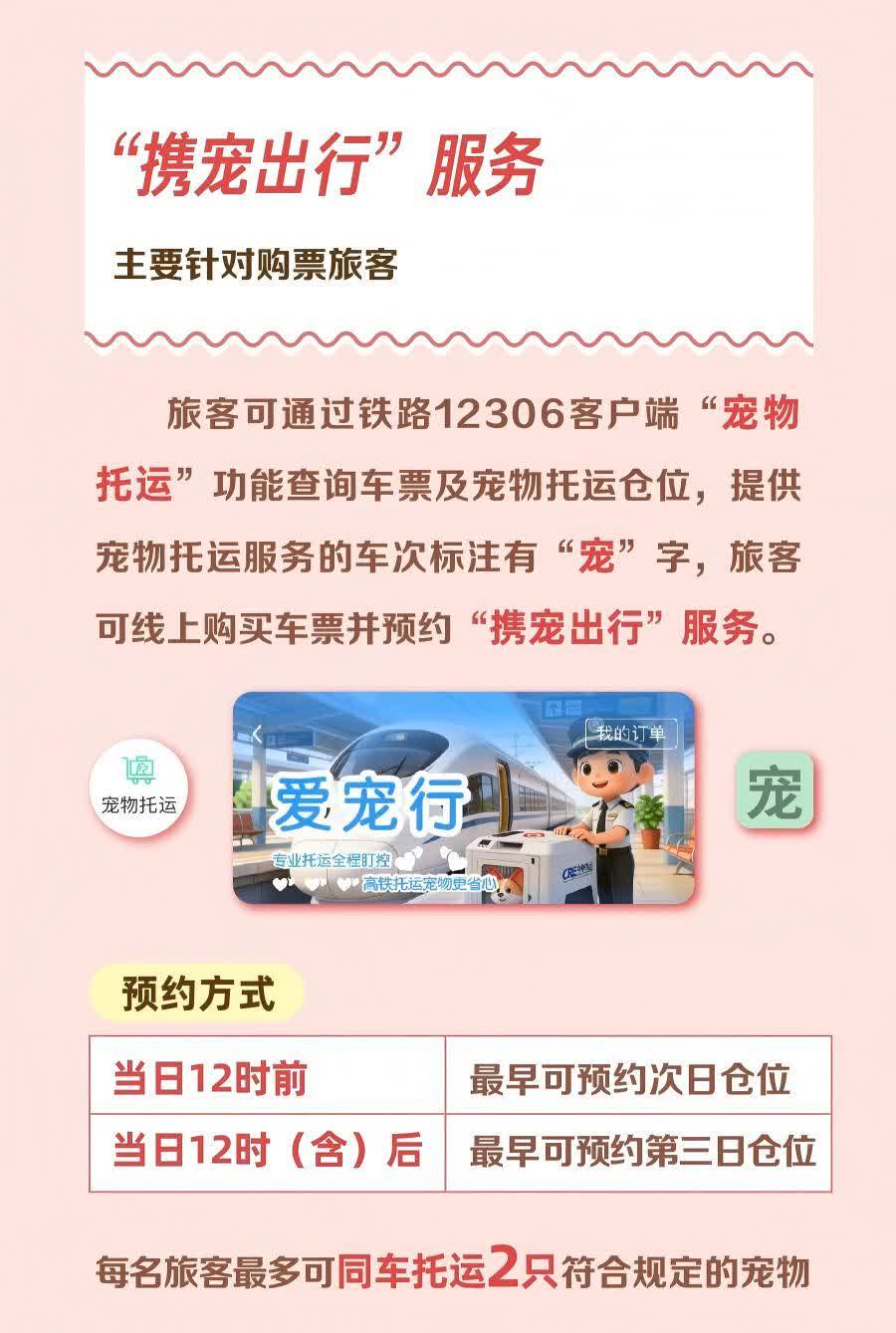 其中,「攜寵出行」服務主要針對購票旅客,旅客可通過鐵路12306客戶端「寵物託運」功能查詢車票及寵物託運倉位,提供寵物託運服務的車次標註有「寵」字,旅客可線上購買車票並預約同車寵物託運服務,每日12時前最早可預約次日倉位,12時(含)後最早可預約第三日倉位,每名旅客最多可同車託運2只符合規定的寵物。