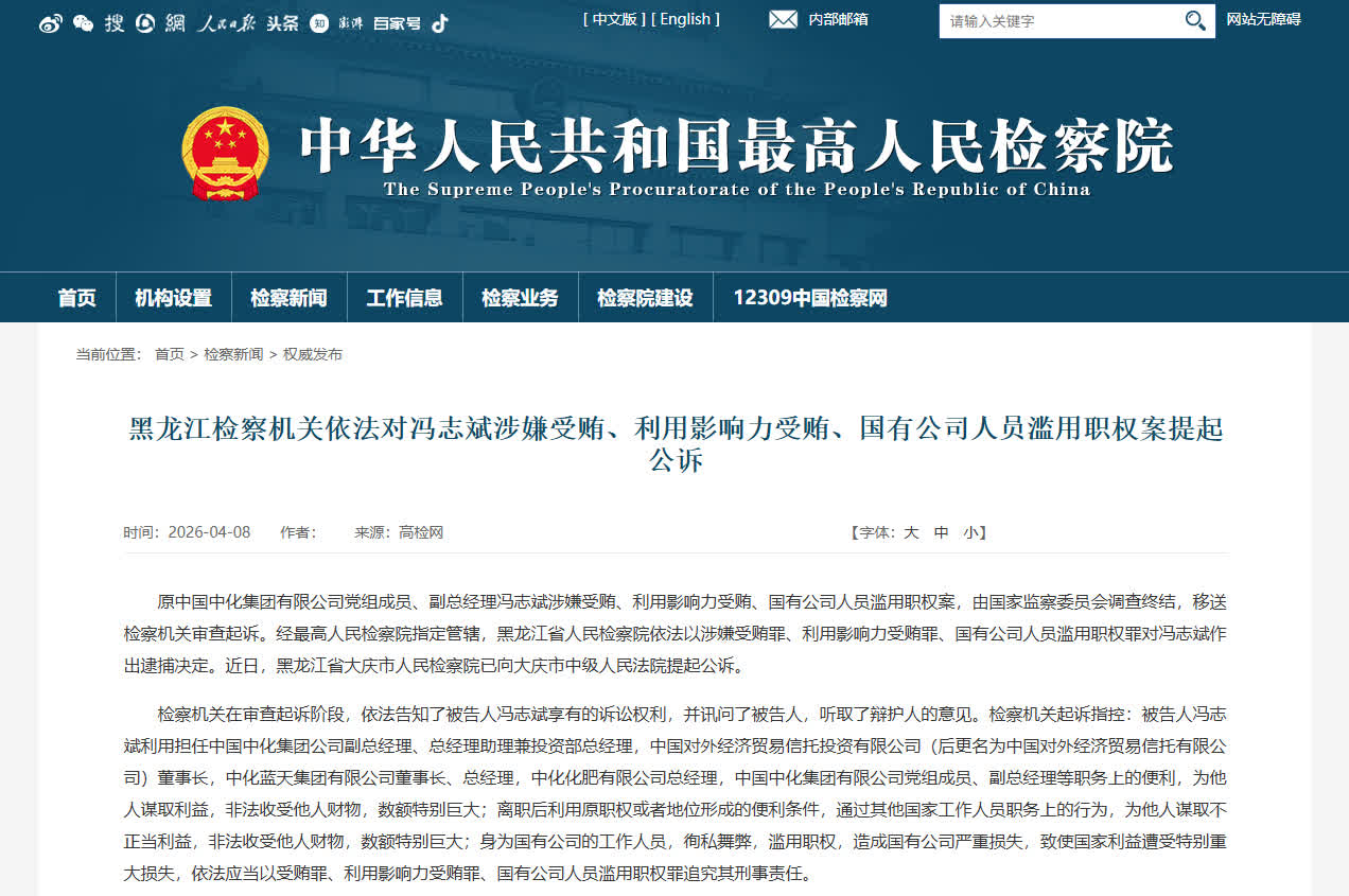 據最高人民檢察院消息,原中國中化集團有限公司黨組成員、副總經理馮志斌涉嫌受賄、利用影響力受賄、國有公司人員濫用職權案,由國家監察委員會調查終結,移送檢察機關審查起訴。經最高人民檢察院指定管轄,黑龍江省人民檢察院依法以涉嫌受賄罪、利用影響力受賄罪、國有公司人員濫用職權罪對馮志斌作出逮捕決定。近日,黑龍江省大慶市人民檢察院已向大慶市中級人民法院提起公訴。