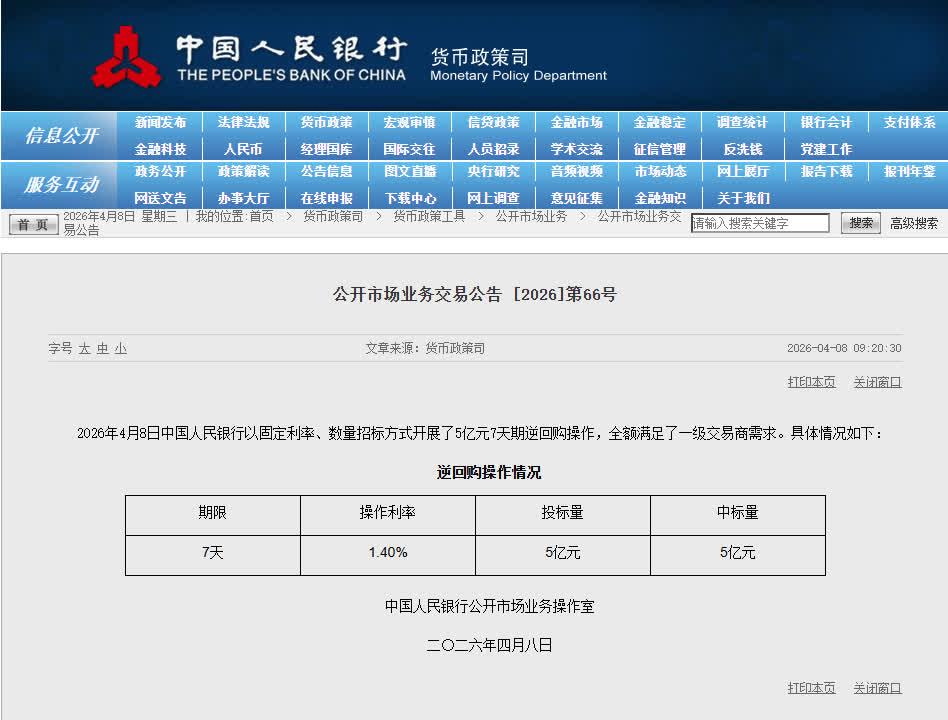 今天(8日),中國人民銀行發布公告,以固定利率、數量招標方式開展了5億元7天期逆回購操作,利率為1.4%,與此前持平。
