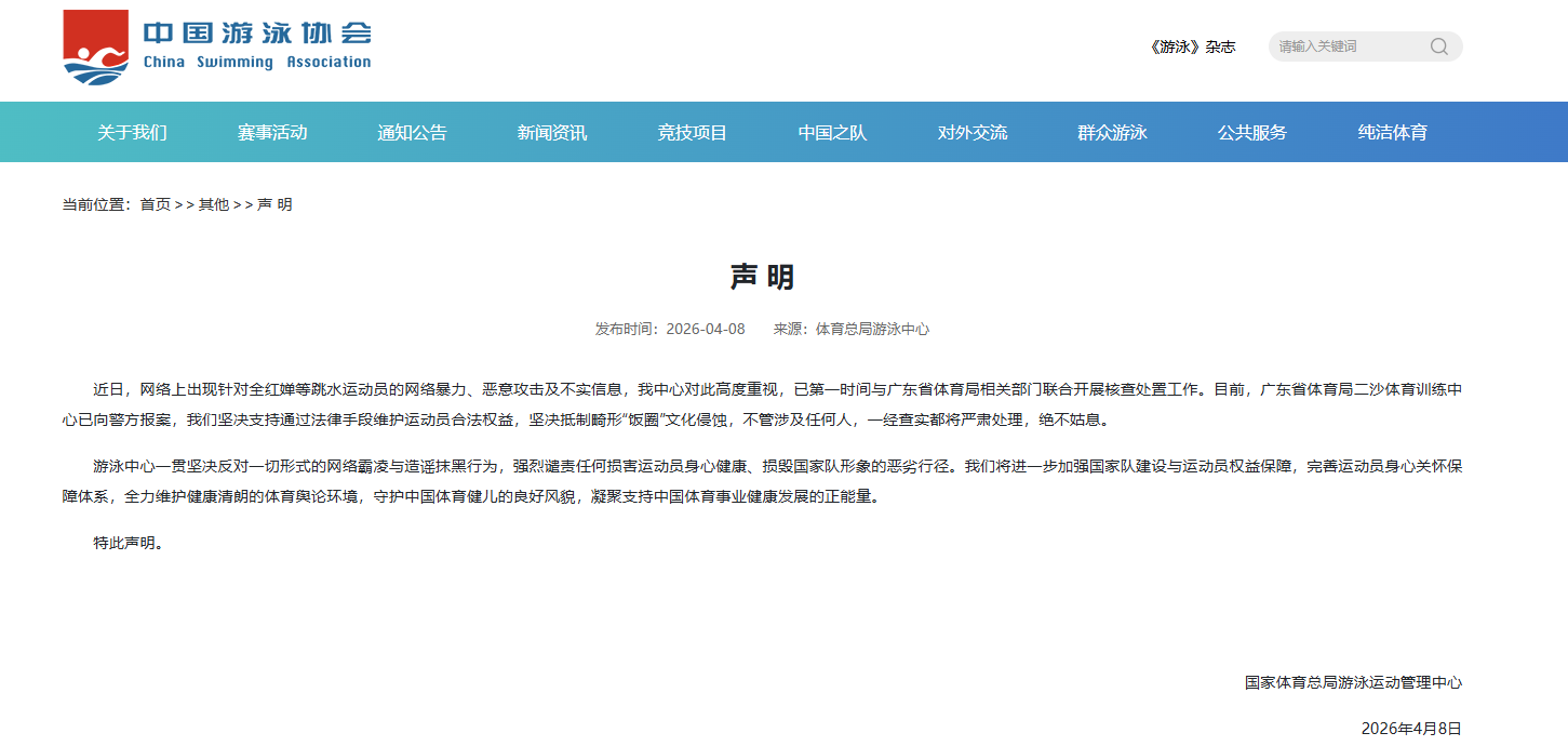 4月8日,國家體育總局游泳運動管理中心就全紅嬋等跳水運動員遭受網暴一事發布聲明,全文如下: