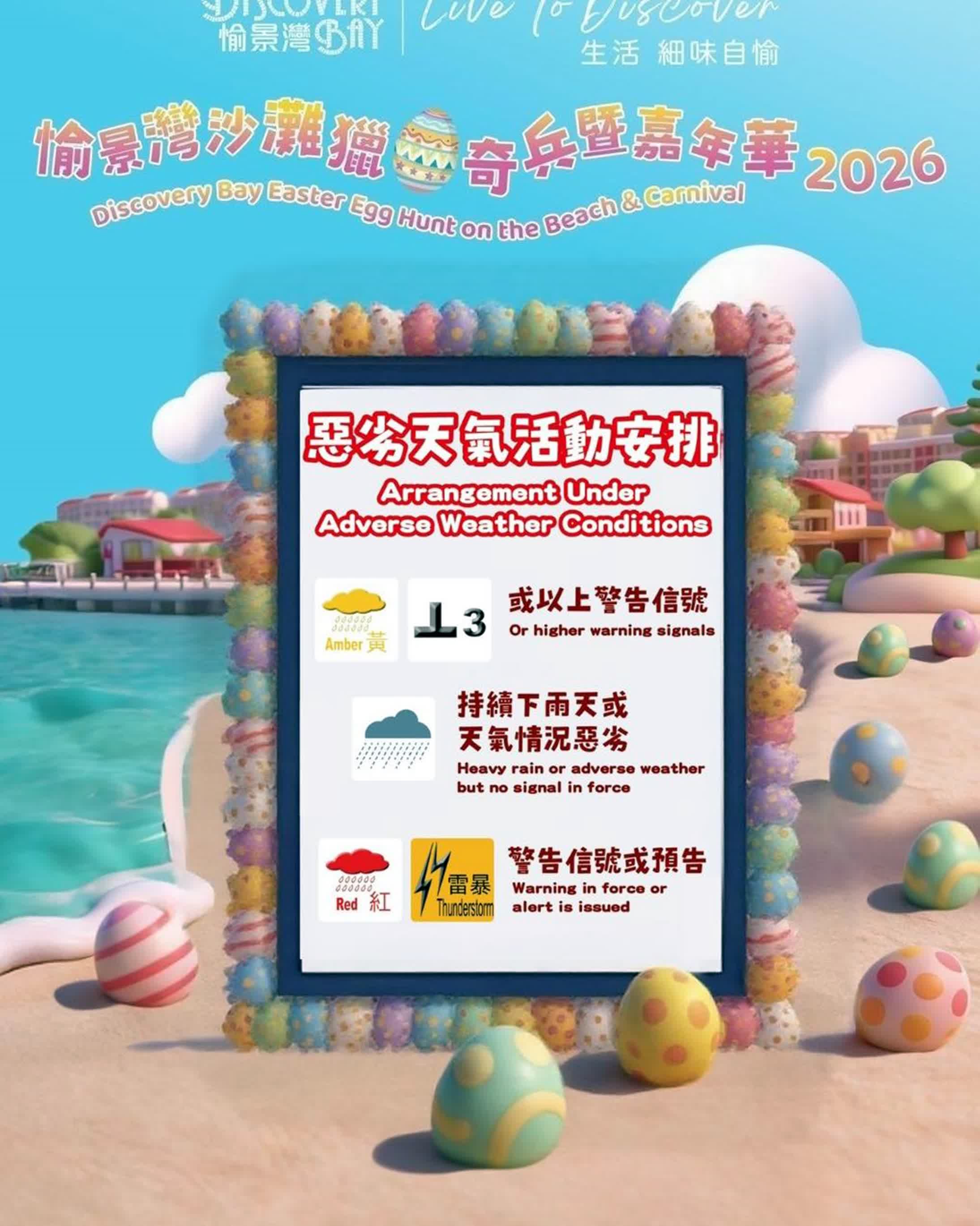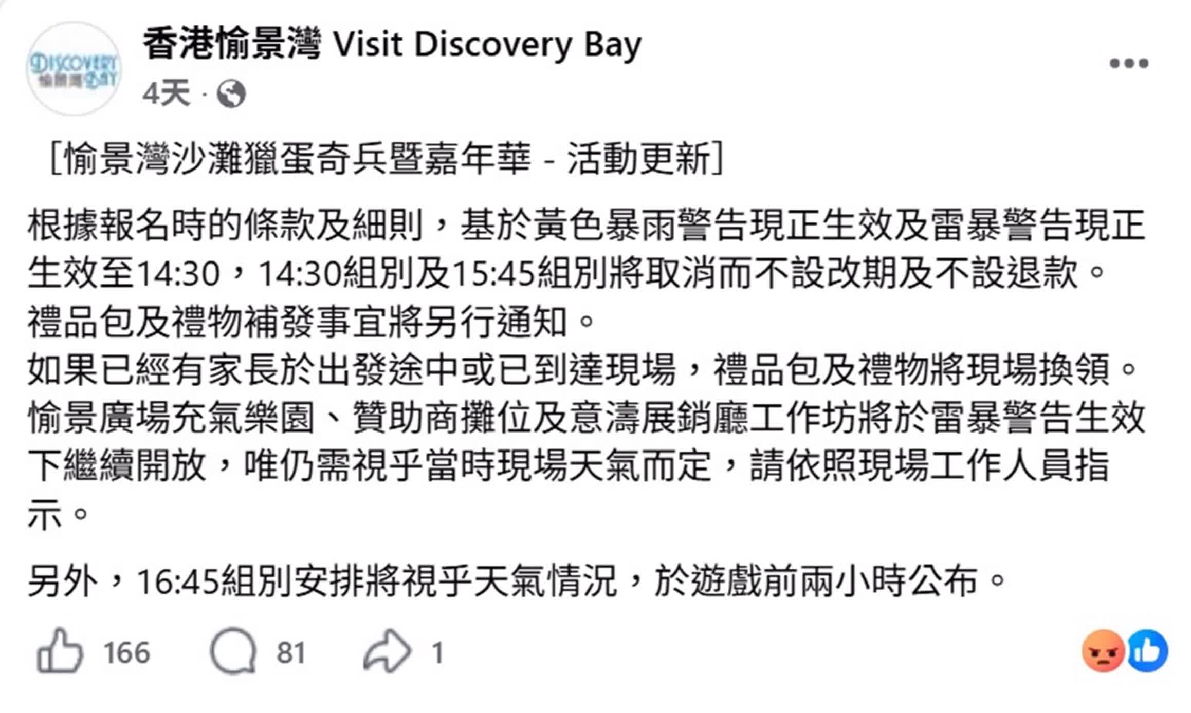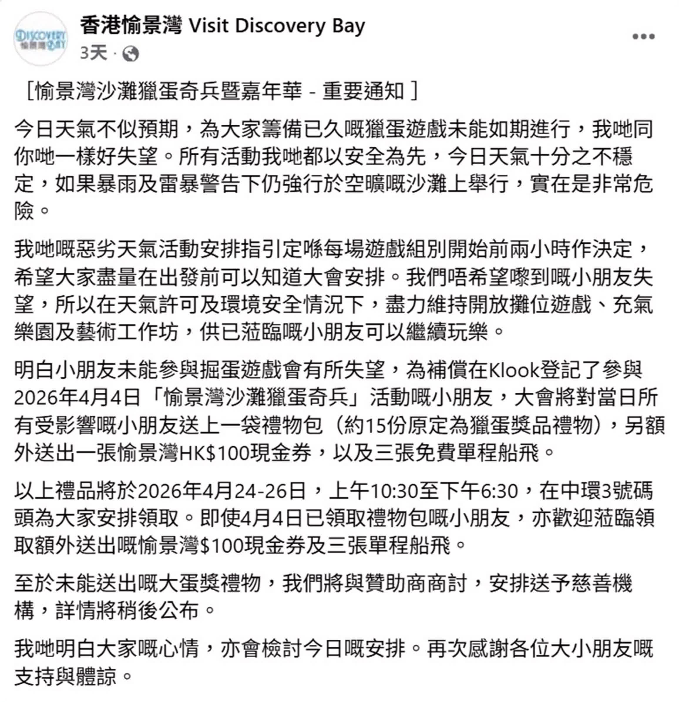 據悉,當日主辦方宣布取消室外沙灘獵蛋環節後,不少家長在社交平台留言表達不滿,包括指主辦方過遲宣布取消相關活動環節,以及不改期及不退款的安排。其後主辦方在深夜「補鑊」,宣布向受影響人士送上禮物包、另額外送出一張愉景灣100元現金券,以及3張免費的單程船飛,禮品將於4月24日至26日在中環3號碼頭安排領取。