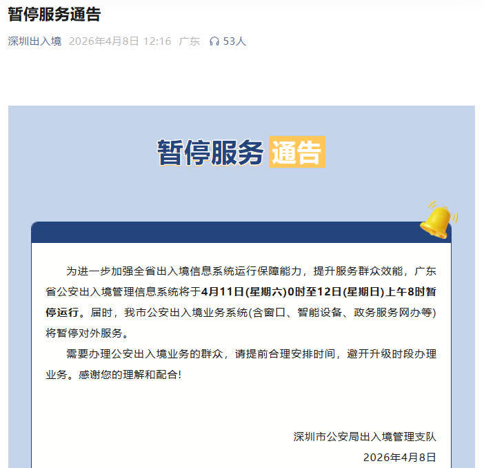 今日(8日),深圳市公安局出入境管理支隊發布公告表示,為進一步加強全省出入境信息系統運行保障能力,提升服務群眾效能,廣東省公安出入境管理信息系統將於4月11日(星期六)0時至12日(星期日)上午8時暫停運行。屆時,深圳市公安出入境業務系統(含窗口、智能設備、政務服務網辦等)將暫停對外服務。
