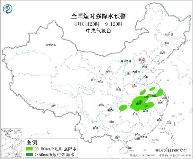 預計4月8日20時至9日20時,江漢、江淮西部、江南北部等地的部分地區將有8級以上雷暴大風或冰雹天氣,其中,湖北東部和南部、湖南西北部、江西北部等地的部分地區將有10級以上雷暴大風,最大風力可達11級以上,局地不排除出現龍卷的可能性;江漢、江淮、江南北部等地的部分地區將有小時雨量大於20毫米的短時強降水天氣,其中,湖北東部、江西北部等地的局地小時雨量大於50毫米。