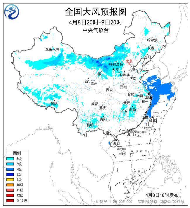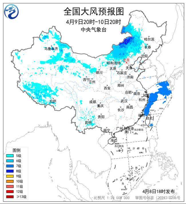 預計,4月8日20時至9日20時,新疆北疆東部和南疆盆地、甘肅河西、內蒙古中西部、寧夏中北部、陝西北部、山西中北部以及遼寧中部、雲南東部、西藏中西部等地有5~7級大風,陣風7~8級;黃海中部和南部海域、東海北部和西南部海域將有7級、陣風8級的風。