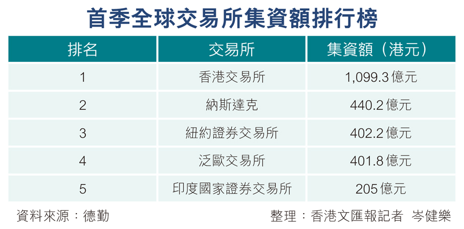 他亦指出,香港交易所在今年第一季有40隻新股上市融資1,099億元,較去年同期的15隻新股融資182億元,分別上升167%及504%。至於美國兩個交易所集資額排名緊隨香港,其中納斯達克有21隻新股上市,合共集資440.2億元;紐約證券交易所有15隻新股上市,合共集資402.2億元,集資額排名第二與第三。泛歐交易所與印度國家證券交易所則排名第四與第五,集資額為401.8億元與205億元。