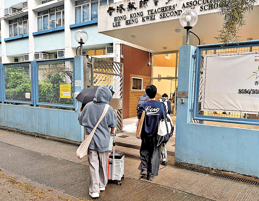 昨日天氣欠佳,下着細雨,大埔教師會李興貴中學是其中一個考場,現場所見,學生陸續帶同畫板、筆刷等應試用具進入考場,有考生在家人陪同下到場「迎戰」,亦有同學結伴而來,互相鼓勵。