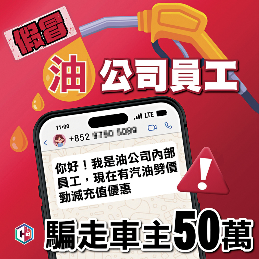 近期油價飆升,對民生的影響逐漸浮現,警方更首次發現有騙徒藉油價議題行騙。有騙徒透過WhatsApp發放「白撞」釣魚訊息,假冒油公司員工,聲稱可提供「汽油充值優惠卡」,其中一名車主不虞有詐,向騙徒的個人銀行戶口轉賬,騙徒再以買得愈多折扣愈多為由誘使加碼,受害車主最終在一個半月內共轉賬逾50萬元,卻沒有收到優惠卡,直至騙徒再要求受害人繳交「個人所得稅」,受害人始驚覺受騙。警方提醒市民,在付款前可使用「防騙視伏器」或「防騙視伏App」評估詐騙風險,如有任何懷疑,應立即終止交易。
