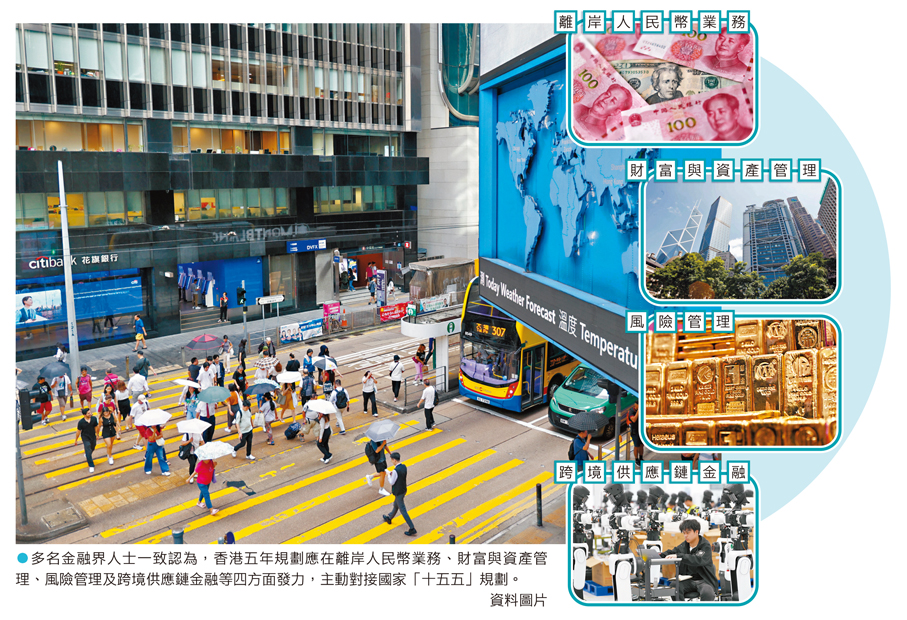 國家「十五五」規劃綱要首次賦予香港構建大宗商品交易生態圈、強化全球離岸人民幣業務樞紐、國際資產及財富管理中心、國際風險管理中心等多項新功能,是香港金融領域首次獲國家層面如此全面定位,這些新功能對香港鞏固提升國際金融中心地位、開闢增長新賽道至關重要。香港特區政府正全速編制首份「香港五年規劃」,主動對接國家「十五五」規劃。香港文匯報訪問了多名金融界人士,他們認為香港五年規劃應在離岸人民幣業務、財富與資產管理、風險管理及跨境供應鏈金融等方面建立長遠發展機制,推動香港從傳統「資金通道」轉型為服務國家實體經濟的「戰略夥伴」。
