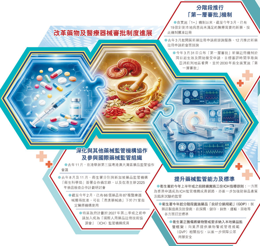 (香港文匯報記者 姬文風)香港特區政府積極對接國家「十四五」規劃及「十五五」規劃,提出支持加快生物醫藥發展、完善創新藥和醫療器械審評審批機制的工作目標,將香港發展成為國際醫療創新樞紐,推進「健康中國」建設。特區政府醫務衞生局向立法會衞生事務委員會提交文件,就成立香港藥物及醫療器械監督管理中心提出立法建議,包括確立藥械監管中心的法定地位及定位、轉移藥物監管權力、優化現時藥物監管架構等,其中備受關注是將中、西藥物的監管權力轉移至衞生署署長,以統整中、西藥的監管職能,理順監管架構,並與國際標準銜接。特區政府計劃在今年下半年將《條例草案》提交立法會審議。