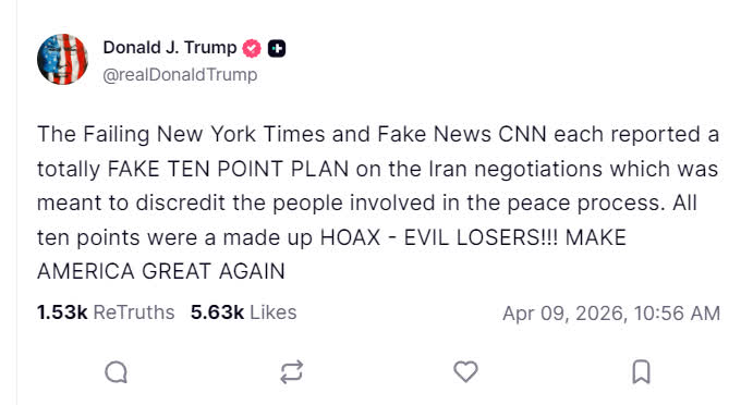 美國總統特朗普8日在社交媒體上發文稱,《紐約時報》和美國有線電視新聞網分別報道了一份關於伊朗停火談判的「完全虛假的10項條款」,「其目的是詆毀參與和平進程的相關人員。這10點內容純屬捏造的騙局」。
