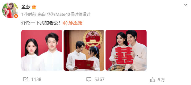 值得一提的是,兩人在多個節目上甜蜜秀恩愛。此前在《愛的修學旅行》中,金莎曾提到,保佑孫丞瀟「永永遠遠愛我,愛我愛到他去世的那一天。」而對方回應,「希望金莎愛我愛5億輩子。」