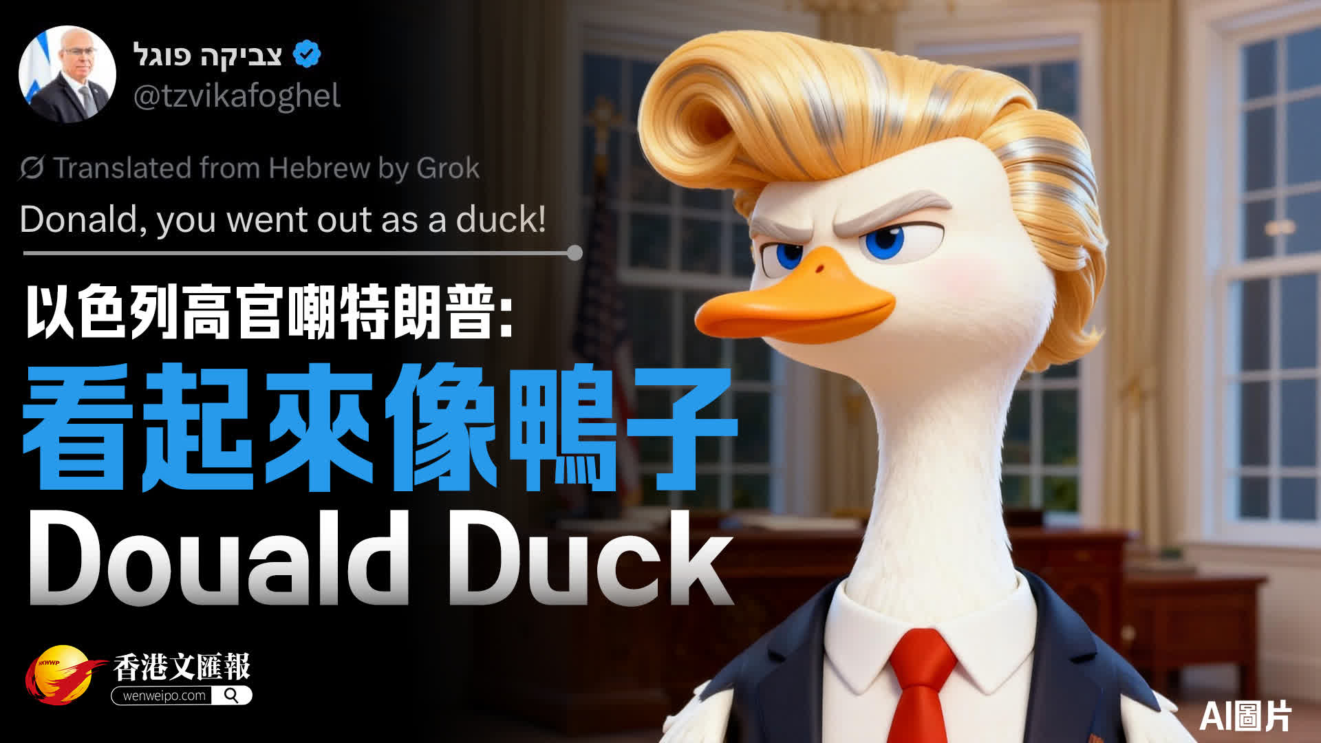 據伊朗媒體及其他外媒報道,以色列國家安全委員會主席茲維卡·沃格爾在社交媒體上發帖嘲笑特朗普:「唐納德(特朗普),你看起來像一隻鴨子(意為『膽小鬼』)!」