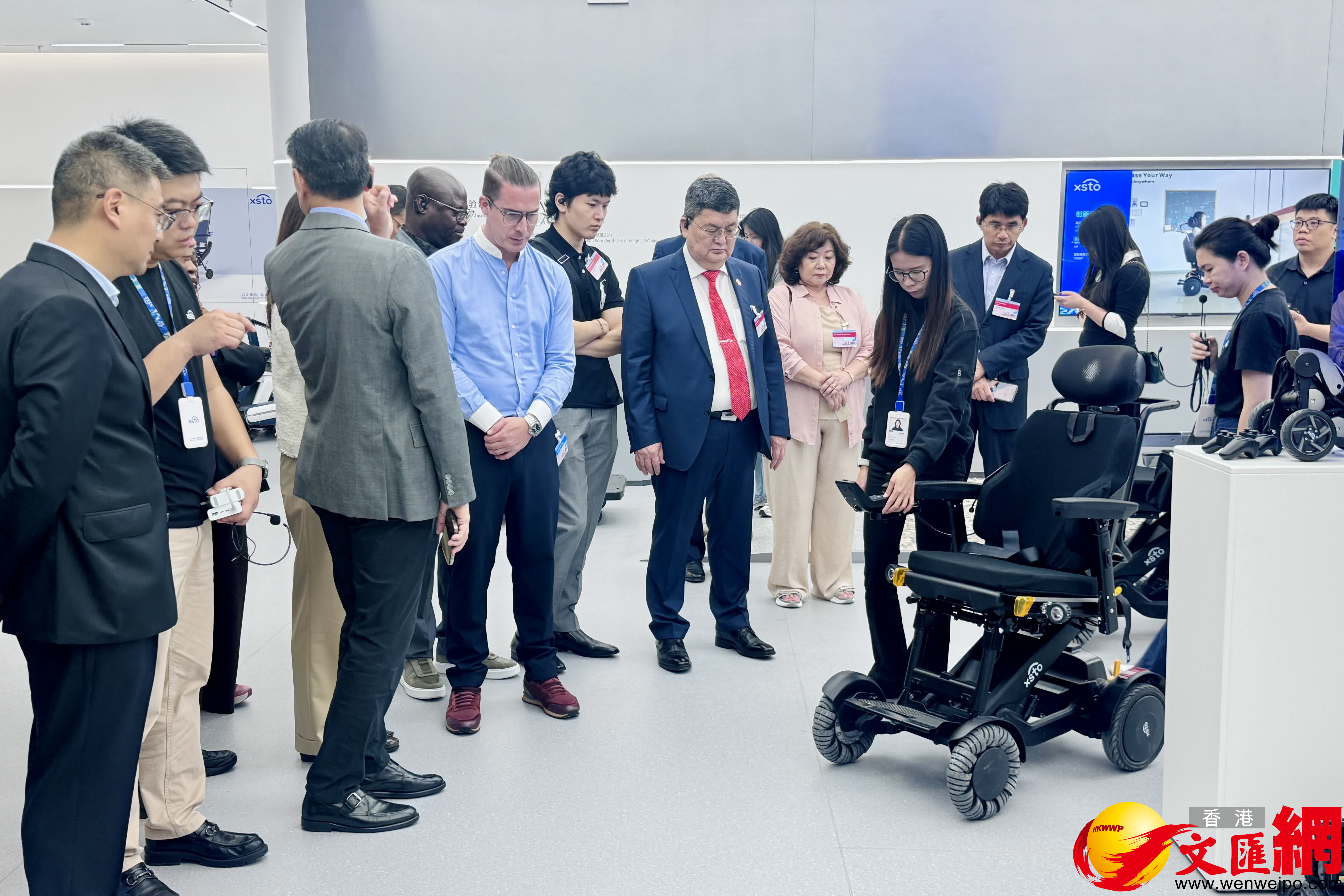 當天上午,參訪團先抵達中山翠亨新區規劃館,再先後到中山小神童創新科技有限公司和中山康方生物醫藥有限公司兩家新質生產力代表企業了解中山創新科技發展。中山小神童創新科技有限公司是一傢具身移動機器人技術和應用綜合提供商,在展廳現場,工作人員現場展示了多種具身智能機器人、智能輪椅、電動載人/載物爬樓機、AI+全地形機器人等高科技產品,機器人一連串流暢絲滑的動作,引得參訪團成員紛紛舉起手機拍攝記錄。