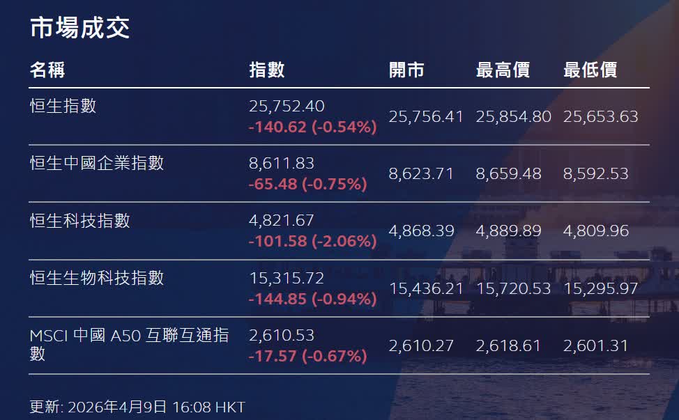 香港文匯報訊 港股今日(4月9日)整體走勢呈區間震盪,三大指數表現分化。恒生指數收報25,752點,全日跌140點或0.54%。國企指數跌0.75%。以科網股為主的恒生科技指數跌2.06%,表現明顯落後於恒指及國指。大市成交額約2,450億元。