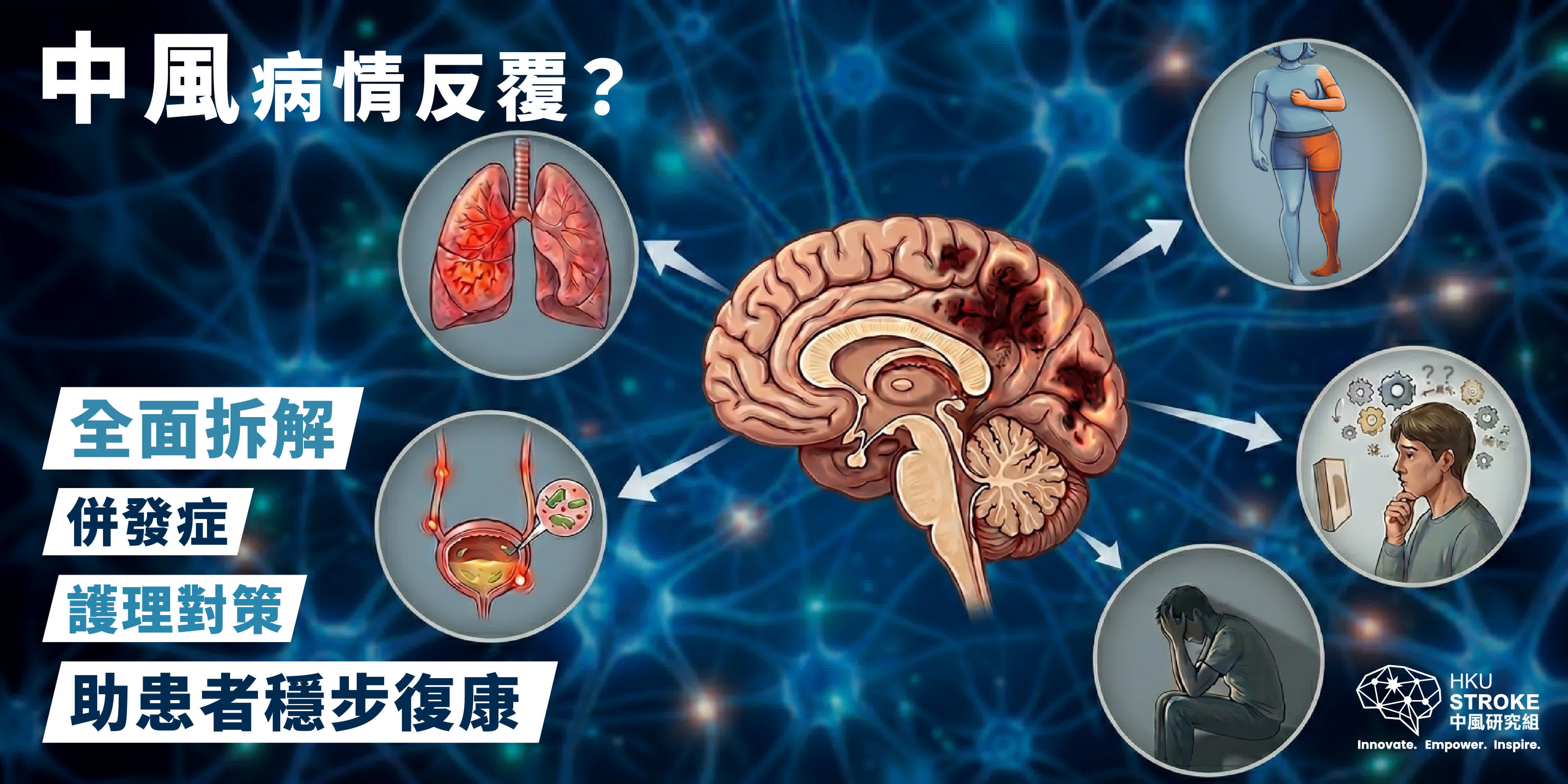 中風往往來得突然。經過緊急搶救後,不少病人和家屬都落力把握中風後六個月的黃金復康期,努力恢復身體功能,期望病情有所進展,卻不時發現康復過程並不穩定,甚至可能出現併發症如吸入性肺炎、痛症、腦癇及抑鬱等,感到擔心和不安。其實,中風後身體並非瞬間回復穩定,仍有機會面對變化多端的病情。因此中風後的管理,除了進行復康訓練,亦要留意和減低併發後遺症的風險,雙管齊下。