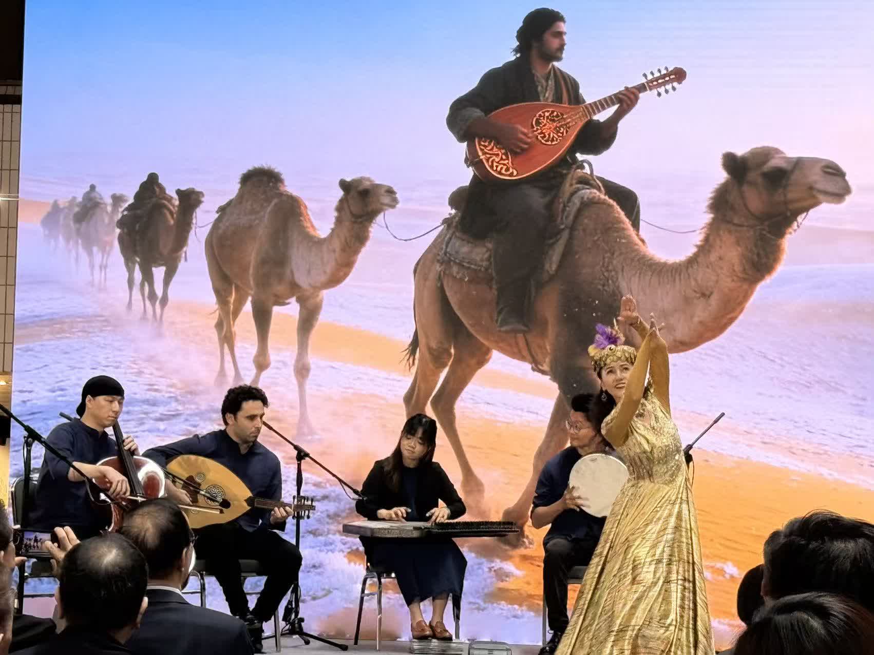 簡介會上還呈現了《絲路迴響·胡樂新聲》音樂會選段。該選段以唐代盛行的樂曲表現方式,呈現節奏明快、風格多樣的曲目,結合了內蒙古呼麥、馬頭琴以及新疆舞、本地中東音樂等。舞者和樂手融為一體,時而讓人想見絲路風情,時而又把人帶入靜謐廣袤的蒙古草原。
