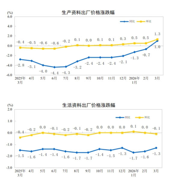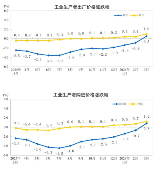 2026年3月份,全國工業生產者出廠價格同比由上月下降0.9%轉為上漲0.5%;環比上漲1.0%,漲幅比上月擴大0.6個百分點。工業生產者購進價格同比由上月下降0.7%轉為上漲0.8%;環比上漲1.2%,漲幅比上月擴大0.5個百分點。一季度,工業生產者出廠價格比上年同期下降0.6%,工業生產者購進價格下降0.5%。