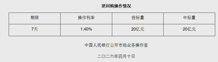 據央行網站消息,2026年4月10日中國人民銀行以固定利率、數量招標方式開展了20億元7天期逆回購操作,全額滿足了一級交易商需求。具體情況如下: