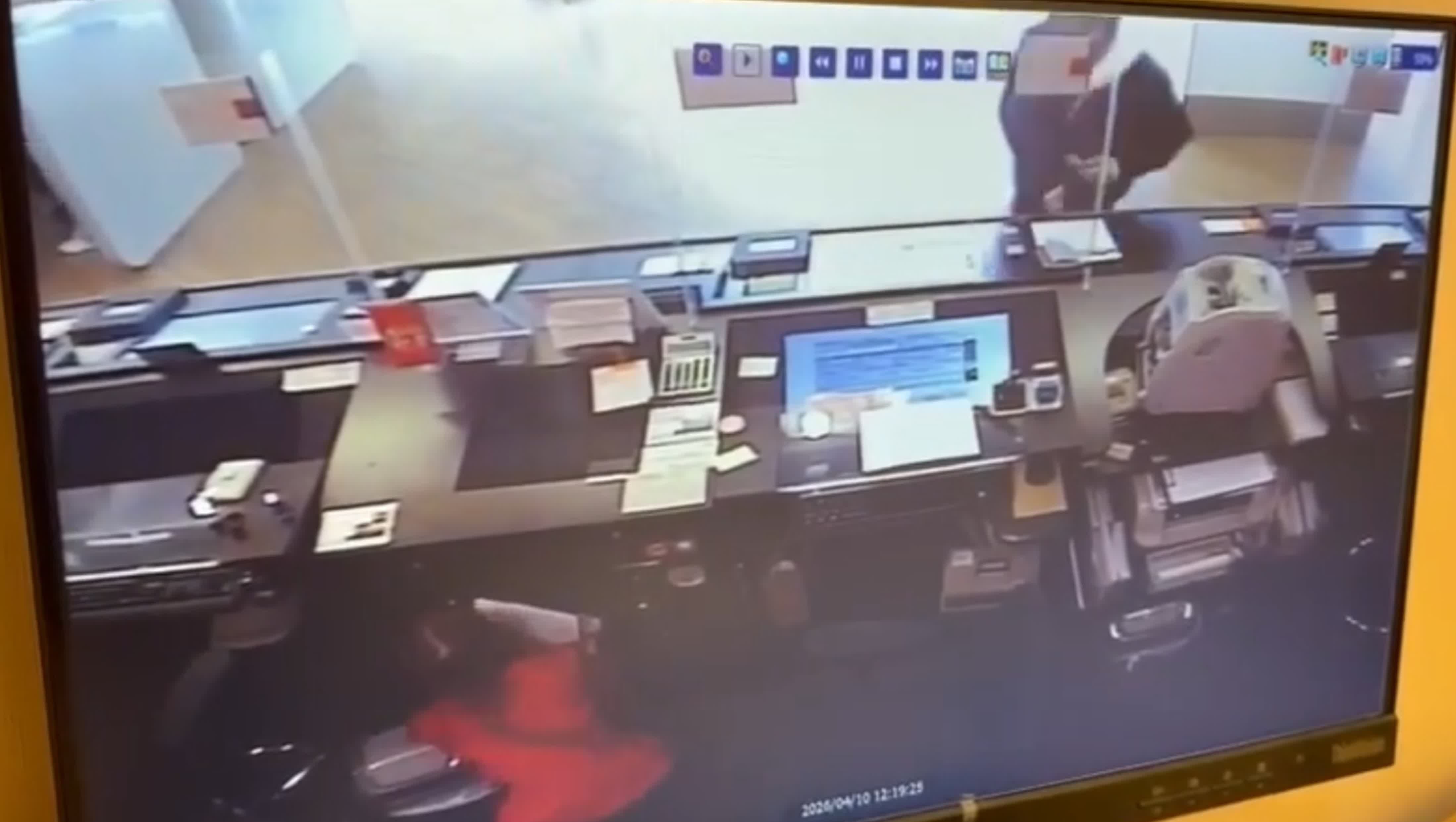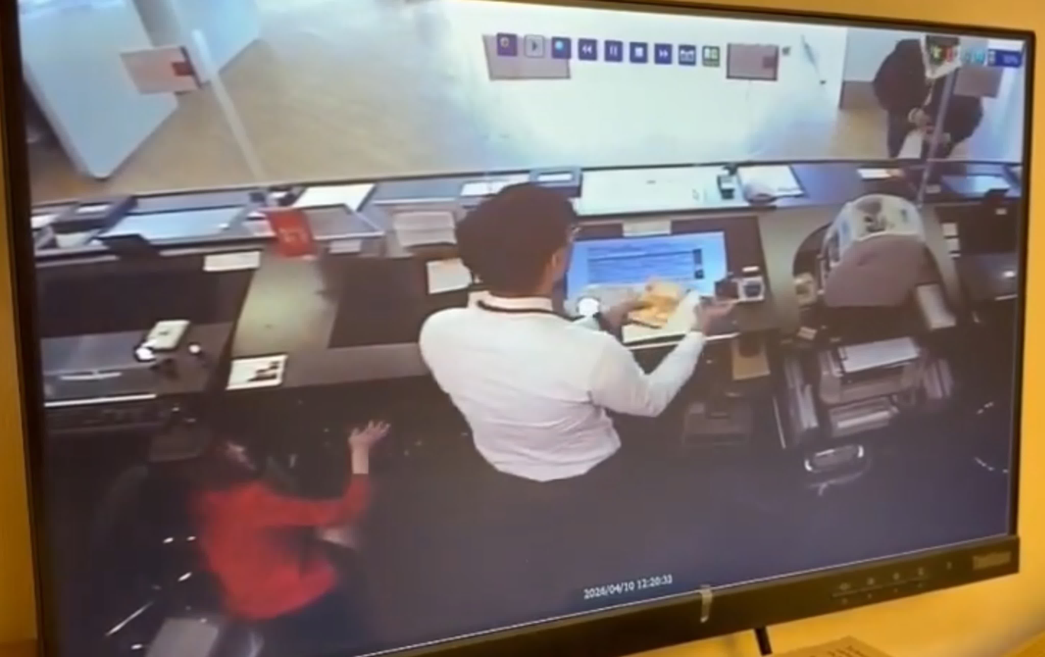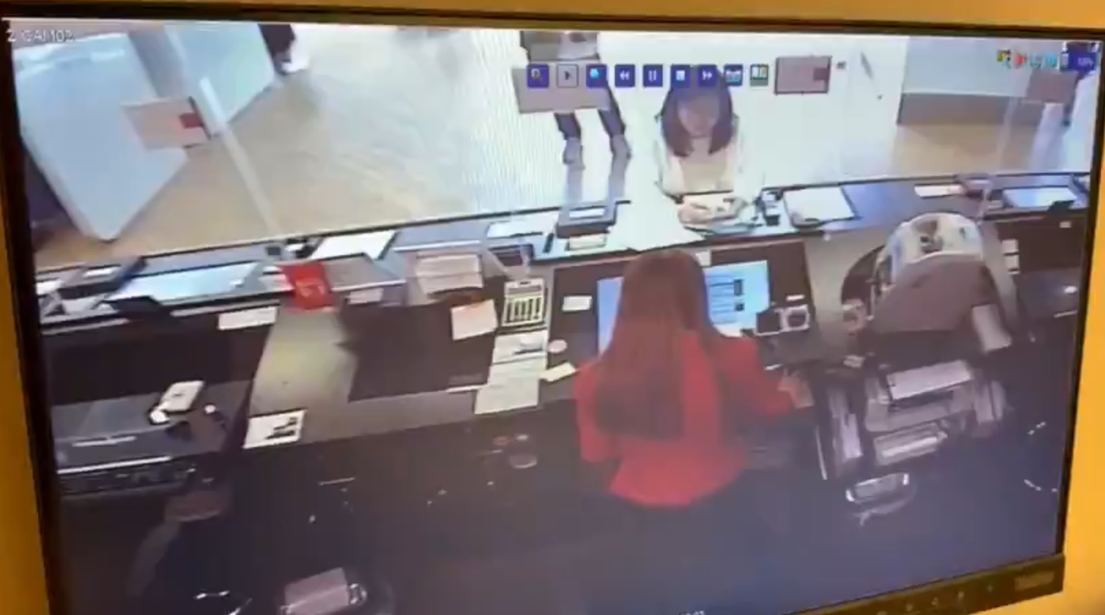 香港文匯報訊(記者 蕭景源)灣仔告士打道東亞銀行遇劫的全過程在「天眼」下曝光。據網上流傳的影片顯示,事發時有一名女顧客正在櫃台前辦理手續,她後面有另一名顧客排隊等候。身穿黑色外套的疑匪亮出黑色手槍物,走近櫃台聲稱打劫,嚇到兩名顧客即時逃離,疑匪向櫃位內放入一個疑似膠袋的物體,當時一名銀行女職員立即蹲在櫃位下躲避。