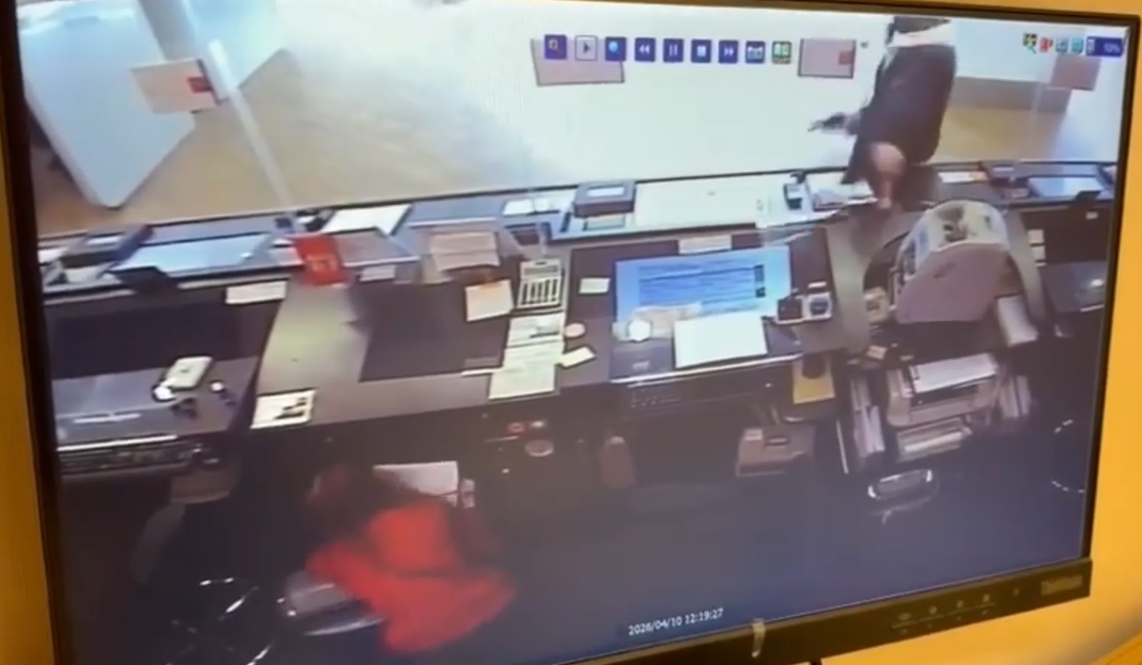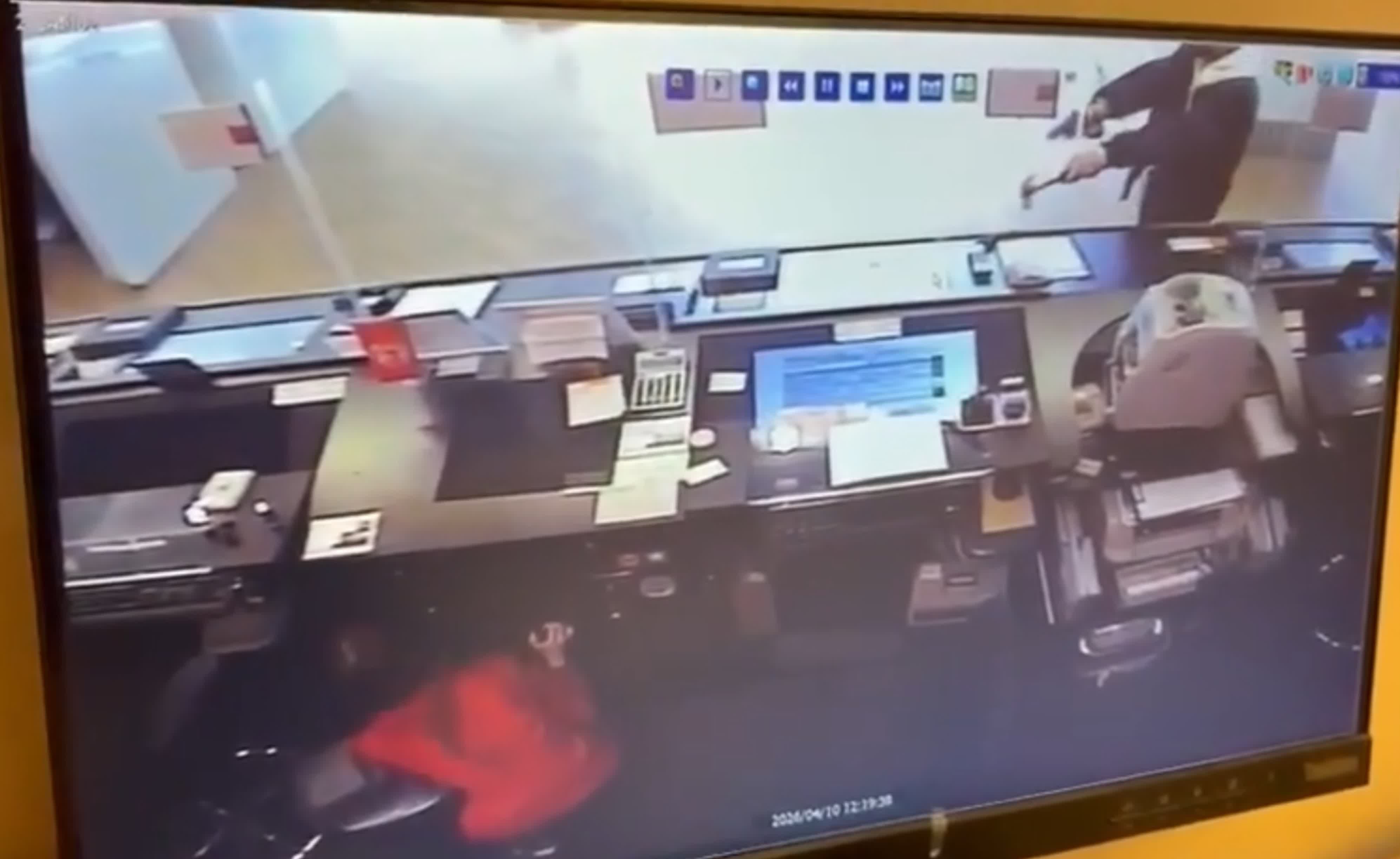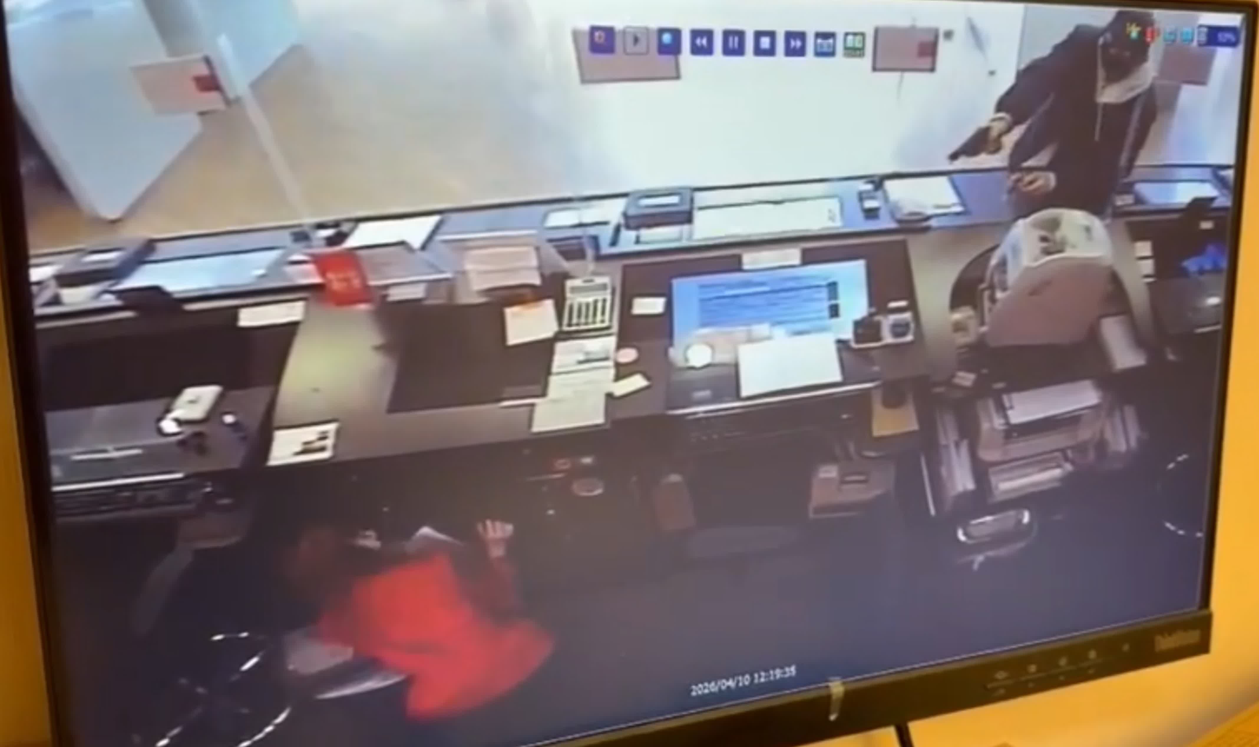 香港文匯報訊(記者 蕭景源)灣仔告士打道東亞銀行遇劫的全過程在「天眼」下曝光。據網上流傳的影片顯示,事發時有一名女顧客正在櫃台前辦理手續,她後面有另一名顧客排隊等候。身穿黑色外套的疑匪亮出黑色手槍物,走近櫃台聲稱打劫,嚇到兩名顧客即時逃離,疑匪向櫃位內放入一個疑似膠袋的物體,當時一名銀行女職員立即蹲在櫃位下躲避。