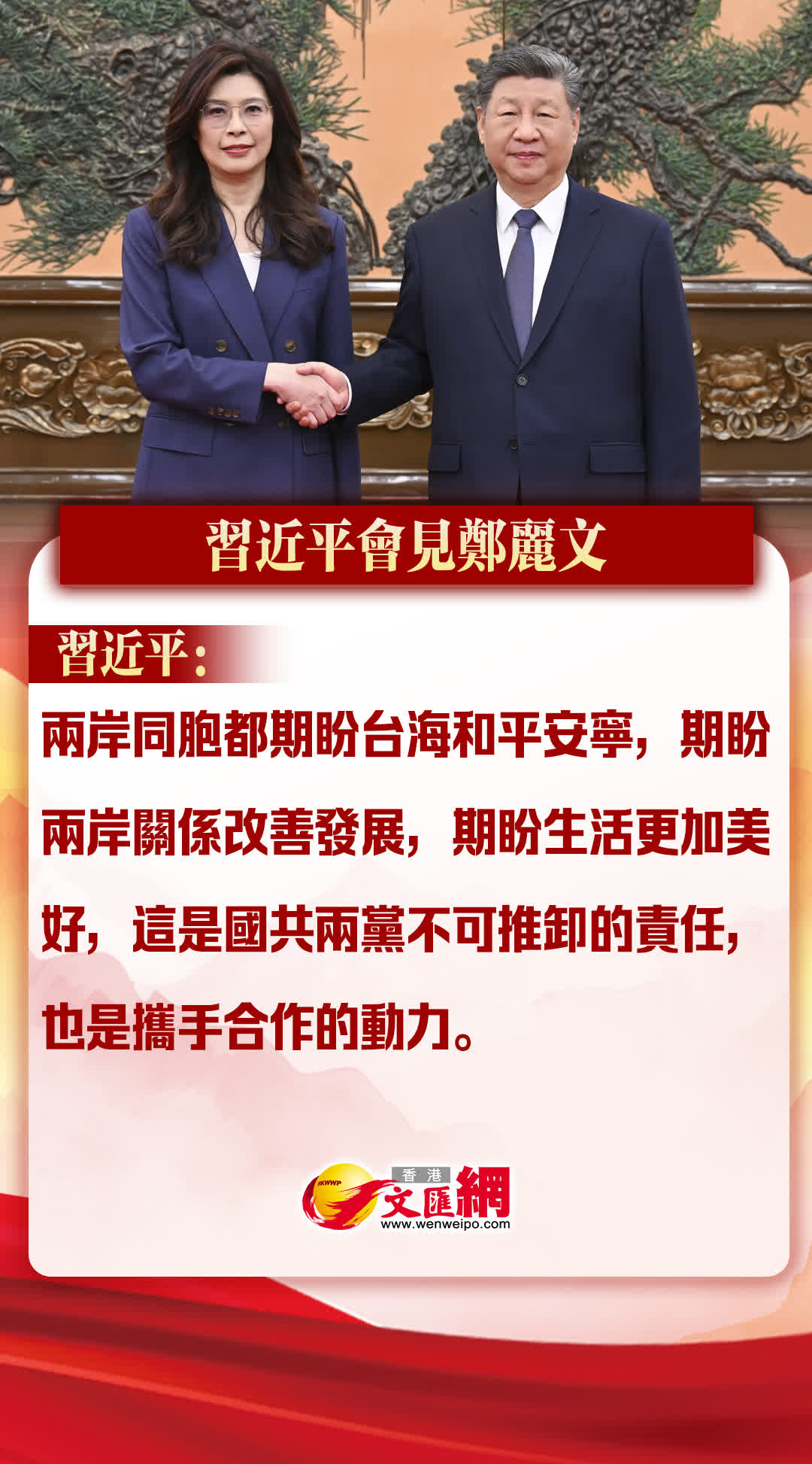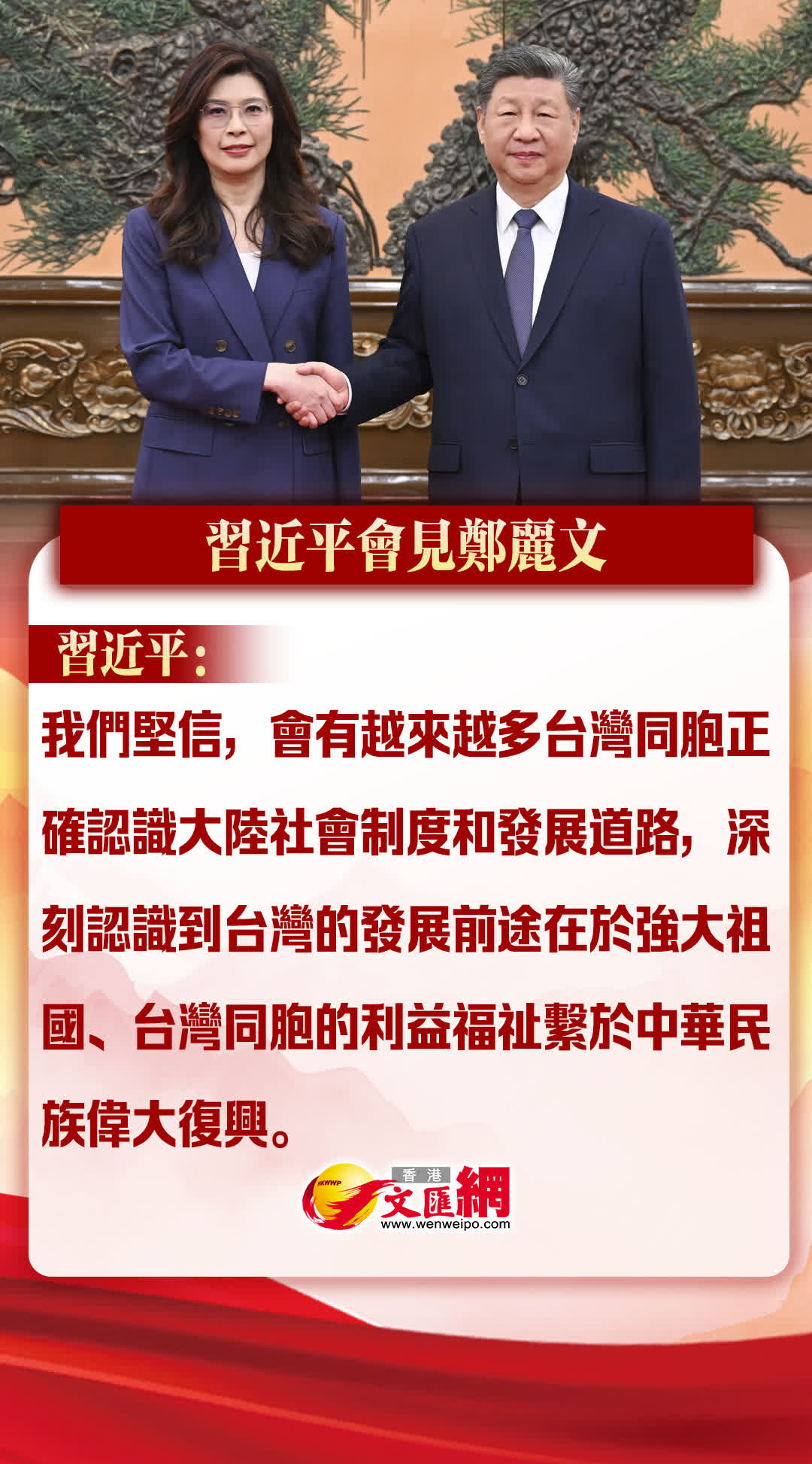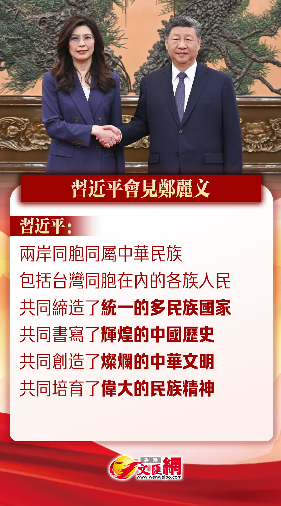 中共中央總書記習近平4月10日上午在北京會見中國國民黨主席鄭麗文。習近平指出,兩岸同胞同屬中華民族,包括台灣同胞在內的各族人民共同締造了統一的多民族國家,共同書寫了輝煌的中國歷史,共同創造了燦爛的中華文明,共同培育了偉大的民族精神,也鑄就了國土不可分、國家不可亂、民族不可散、文明不可斷的共同信念,引領中華民族自強不息、中華文明綿延不斷。