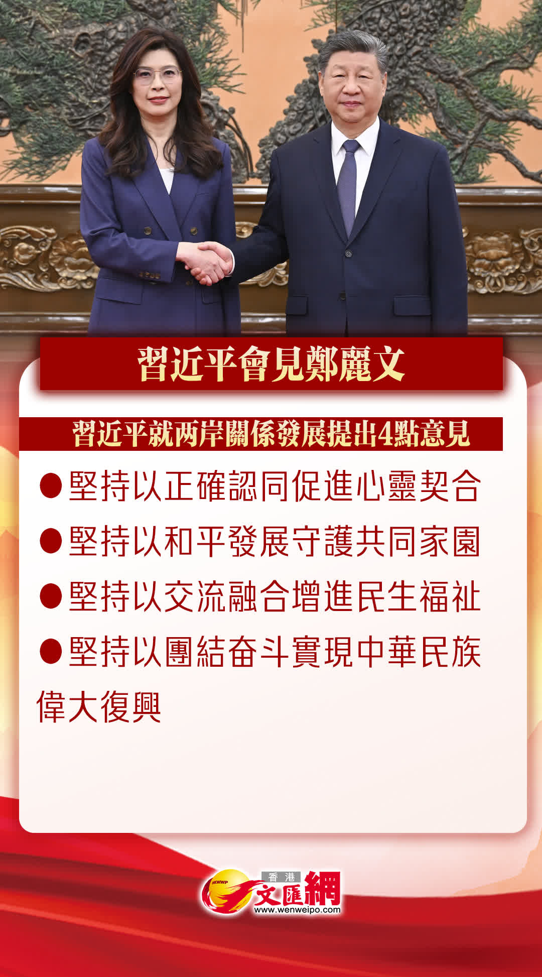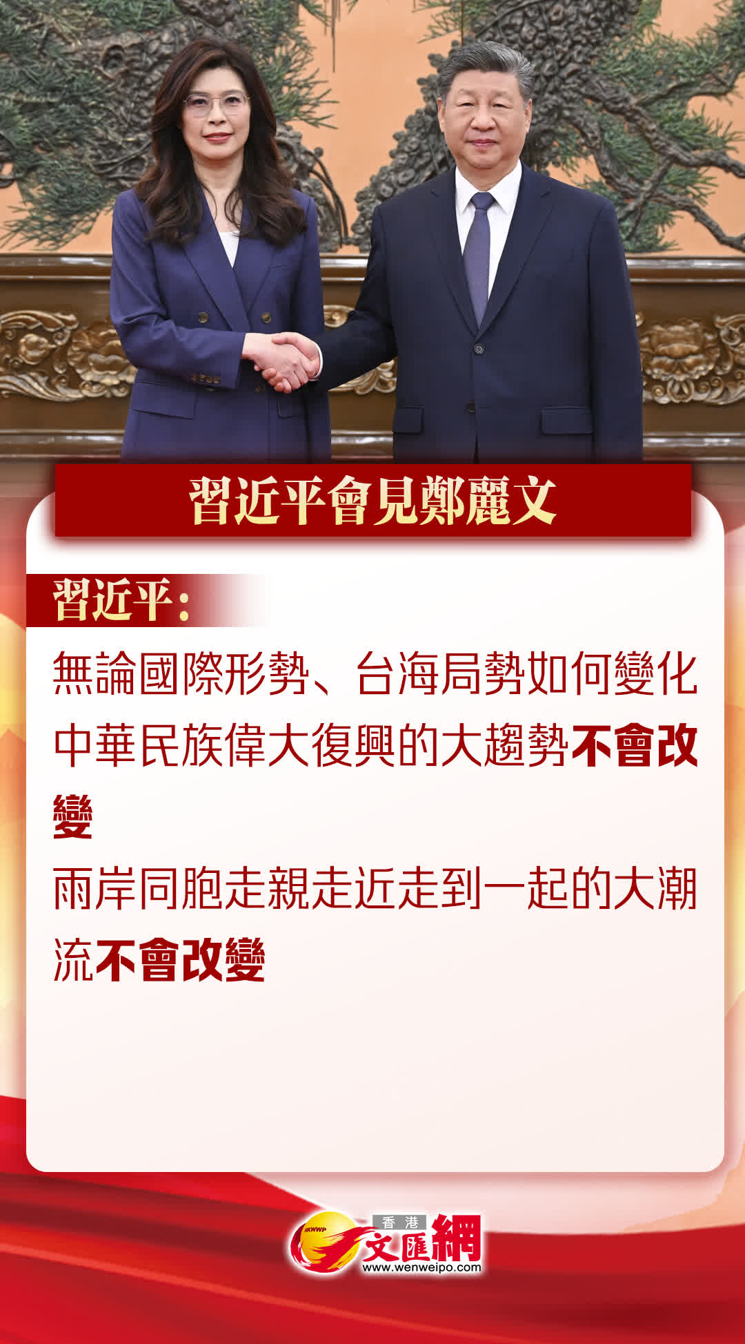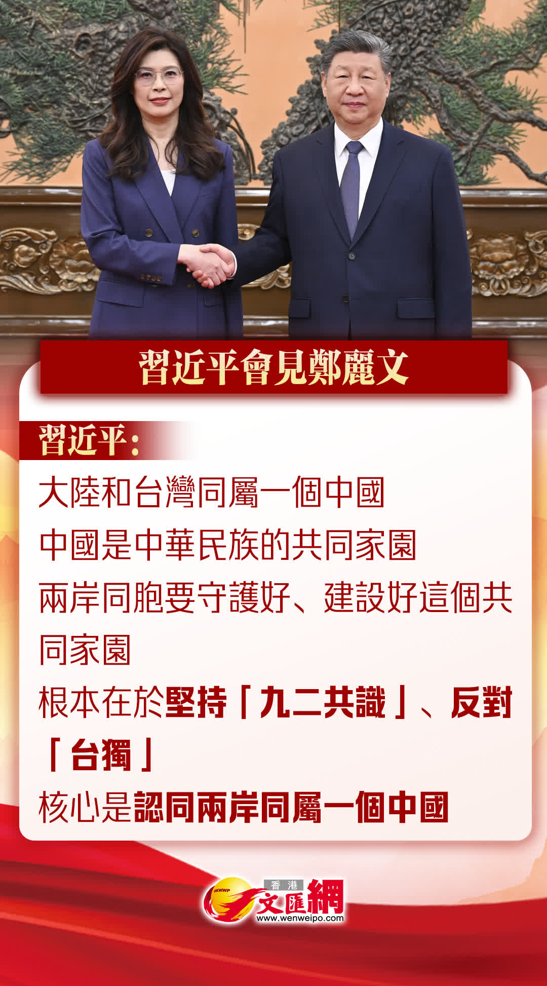 中共中央總書記習近平4月10日上午在北京會見中國國民黨主席鄭麗文。習近平指出,兩岸同胞同屬中華民族,包括台灣同胞在內的各族人民共同締造了統一的多民族國家,共同書寫了輝煌的中國歷史,共同創造了燦爛的中華文明,共同培育了偉大的民族精神,也鑄就了國土不可分、國家不可亂、民族不可散、文明不可斷的共同信念,引領中華民族自強不息、中華文明綿延不斷。