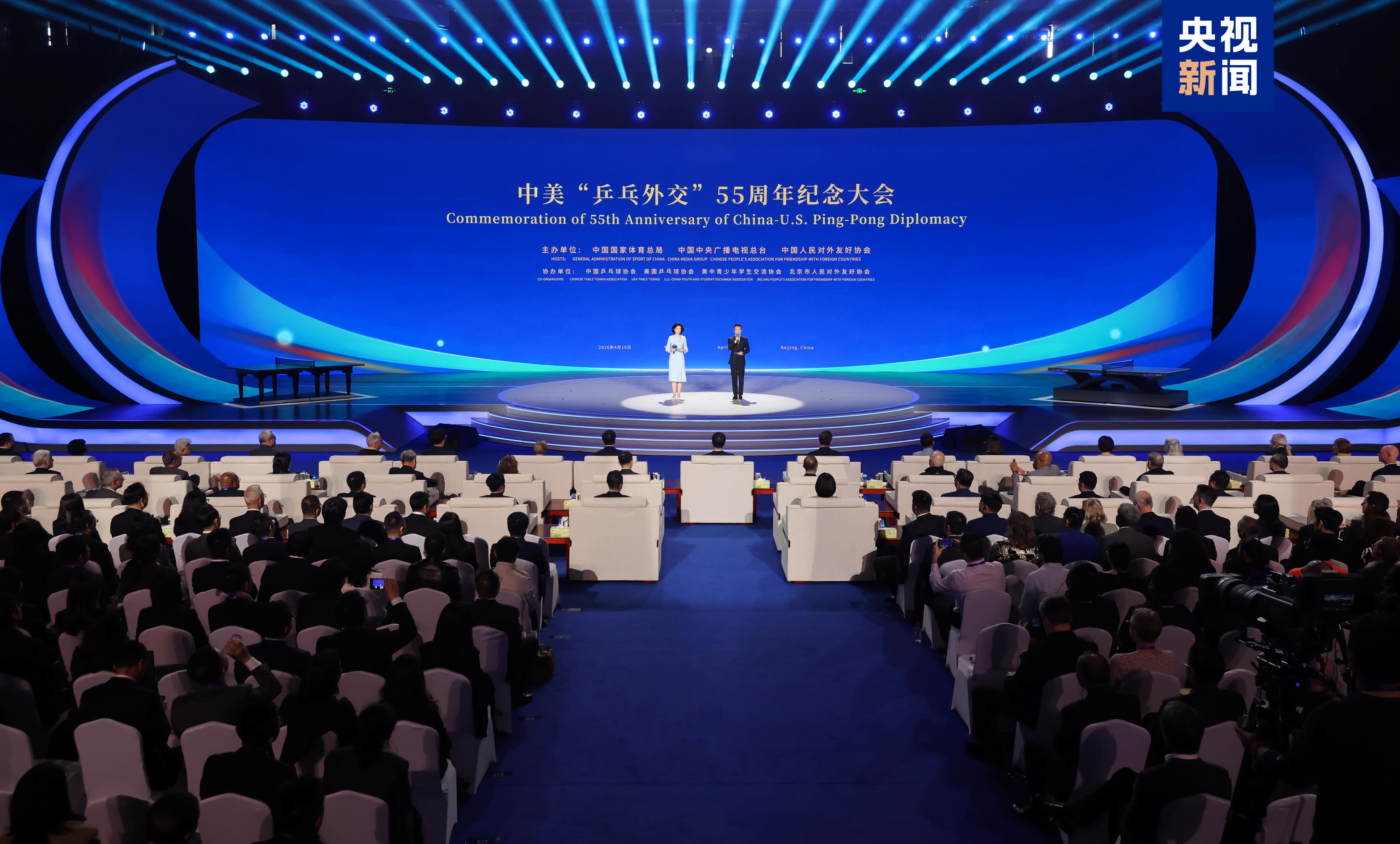 4月10日,中美「乒乓外交」55周年紀念大會在北京首都體育館舉行。大會由中國國家體育總局、中國中央廣播電視總台、中國人民對外友好協會共同主辦,中國乒乓球協會、美國乒乓球協會、美中青少年學生交流協會、北京市人民對外友好協會協辦。紀念大會以「同球共濟 和合共贏」為主題,重溫「小球轉動大球」的歷史性時刻,賡續中美民間友好傳統,推動兩國青少年體育人文交流持續深化。來自中美兩國政府及機構代表、國際組織代表、中美「乒乓外交」親歷者代表、體育界知名人士、媒體界代表及兩國青少年代表等500餘位嘉賓出席活動。「中美青少年體育交流系列活動」正式啟動。