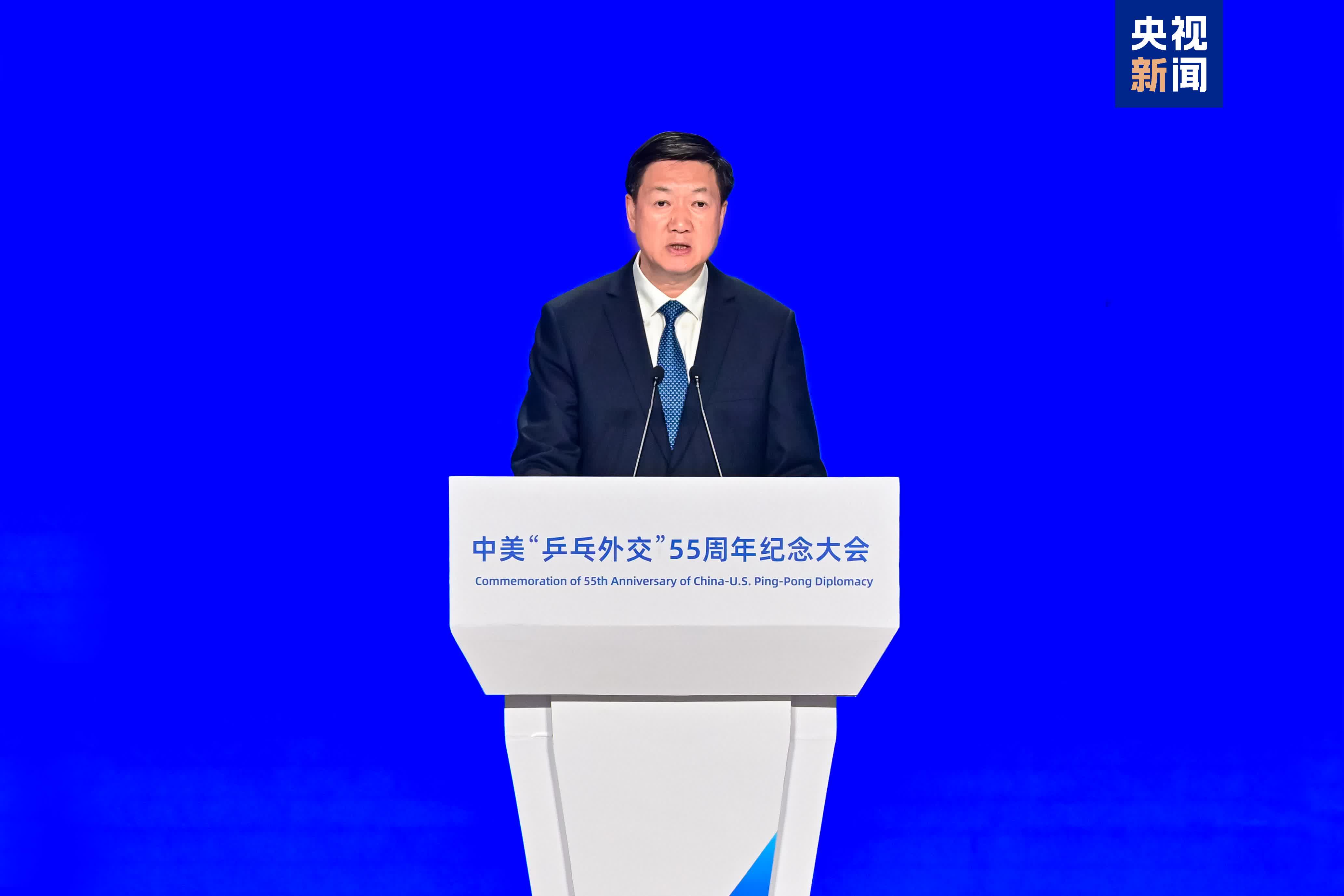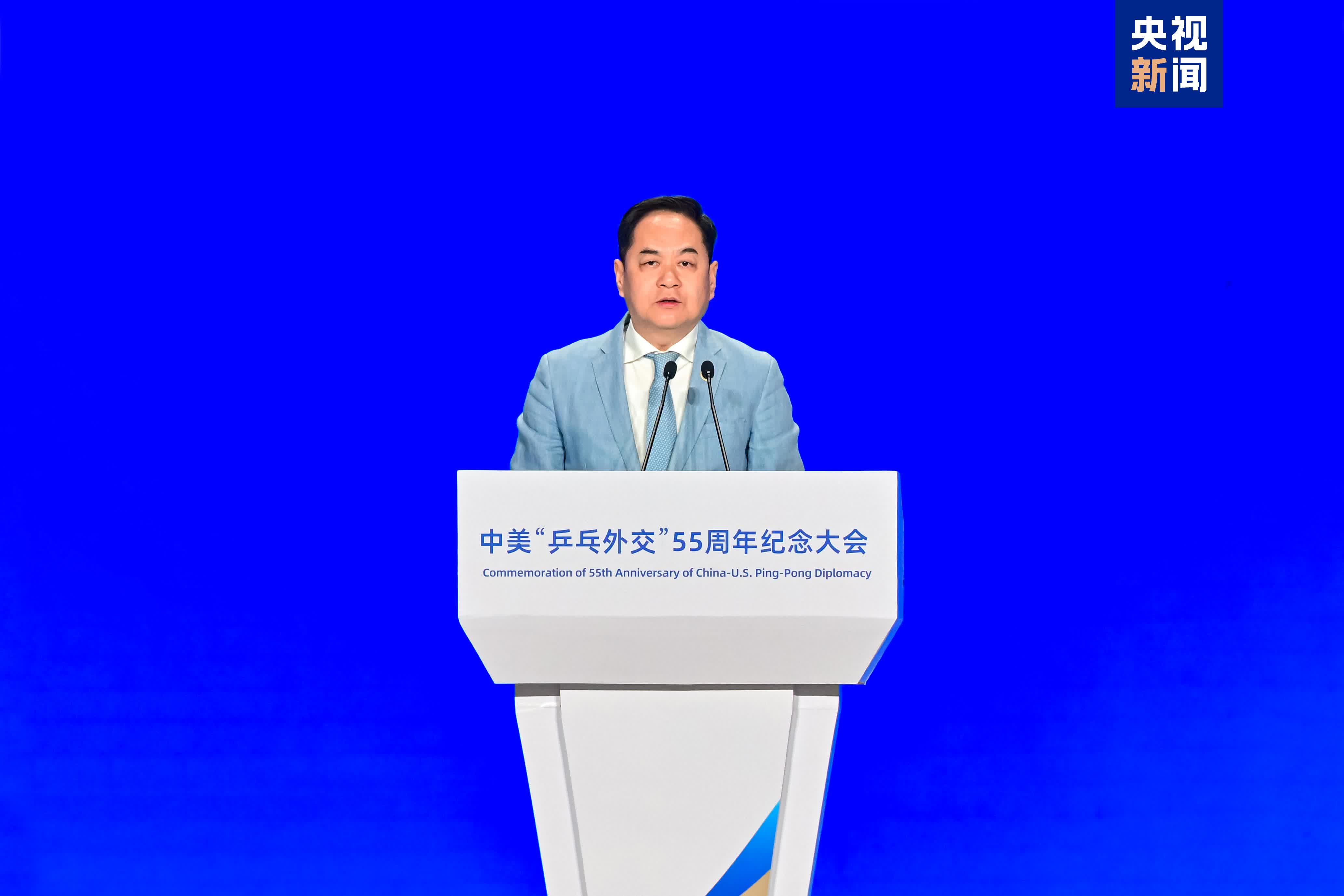 國家體育總局局長高志丹在致辭時表示,體育是人類共同語言,是促進民心相通和文明互鑒的橋樑紐帶。55年來,在「乒乓外交」精神感召下,中美兩國體育界開展了廣泛深入而富有成效的交流與合作,為兩國關係健康發展持續注入穩定性和正能量。體育承載着人類對和平、團結、進步的美好追求,為兩國人民特別是青少年共同喜愛。期待兩國青年一代接過友誼的接力棒,讓和平、友誼、合作的種子在兩國青年心中生根發芽,讓「乒乓外交」的火種代代相傳、生生不息。國家體育總局願同包括美國在內的國際體育界攜手前行,共同踐行「更快、更高、更強——更團結」的奧林匹克格言,持續發揮體育獨特作用和綜合價值,為中美「乒乓外交」賦予新的時代內涵,為促進兩國民心相通、增進世界人民友誼、推動構建人類命運共同體作出新的更大貢獻。