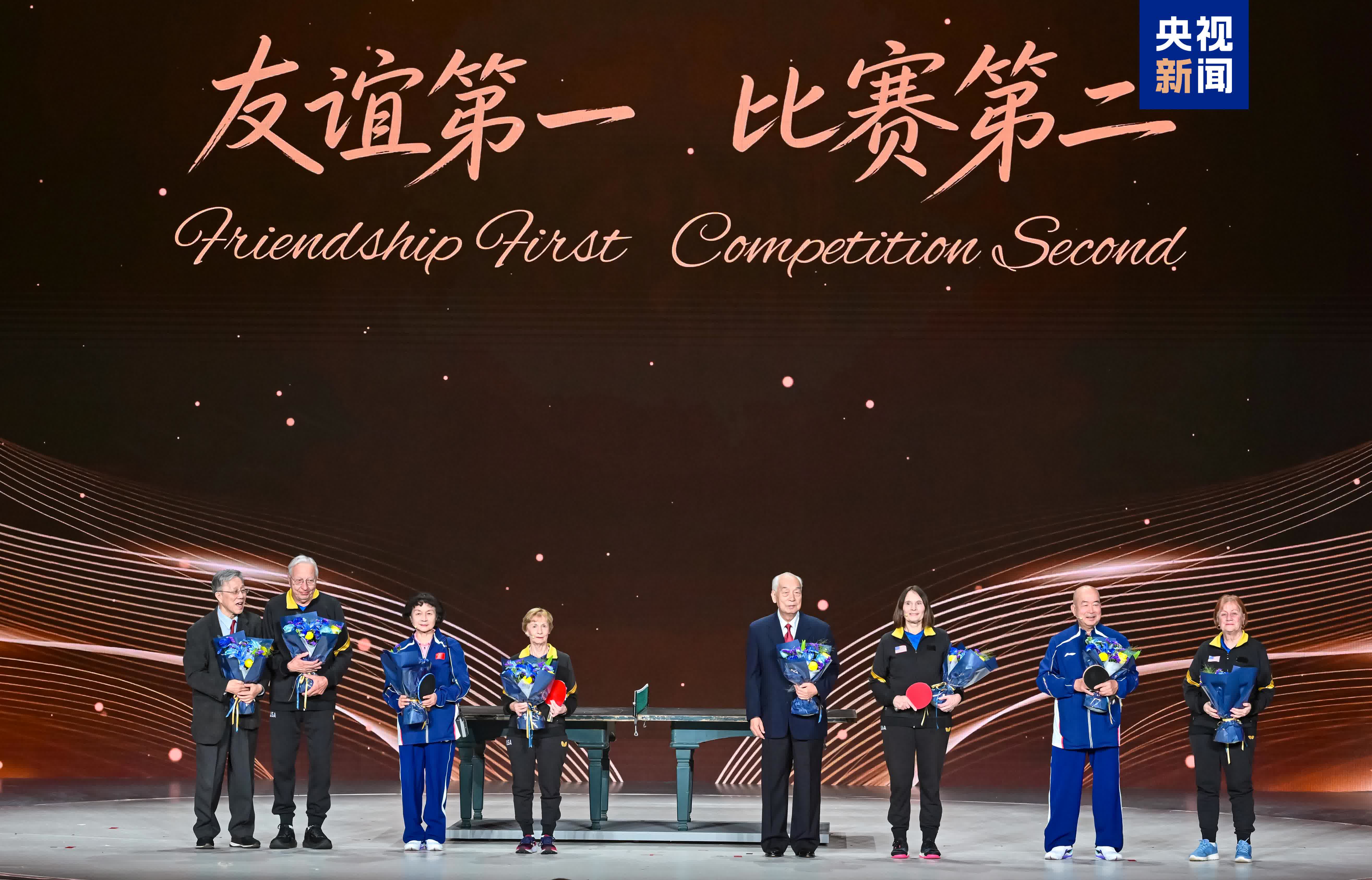 紀念大會上,梁戈亮、鄭敏之、康妮·史維利斯、朱迪·霍夫羅斯特等中美「乒乓外交」親歷者同台,深情回望55年前那段跨越山海的乒乓情緣,娓娓道來「小球轉動大球」背後的動人故事。隨後,他們再次揮拍展開「友誼之球」表演賽,將現場觀眾拉回55年前那個打破隔閡、傳遞善意的歷史瞬間。表演賽結束後,多位當年「乒乓外交」的親歷者上台接受青少年代表獻花。這一幕,既是對歷史的致敬,也象徵着「乒乓外交」精神在年輕一代手中的傳承與延續。
