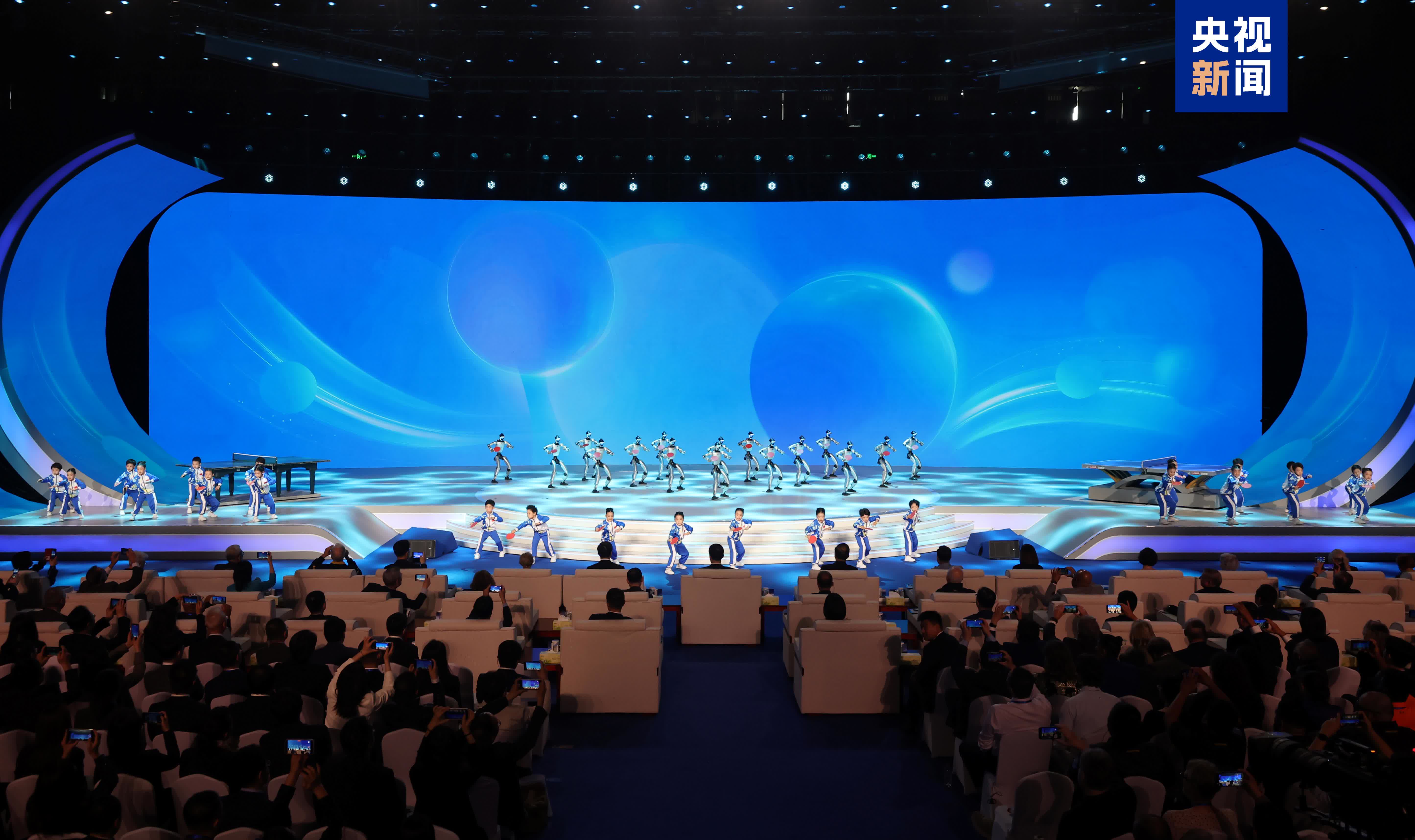 人機共舞節目《躍動乒乓》活力上演。舞台上,少年兒童與機器人並肩起舞,以靈動的舞姿銜接揮拍對打等專業動作,將乒乓球運動的競技張力與科技創新的獨特魅力融為一體,生動詮釋出乒乓運動的躍動之美。