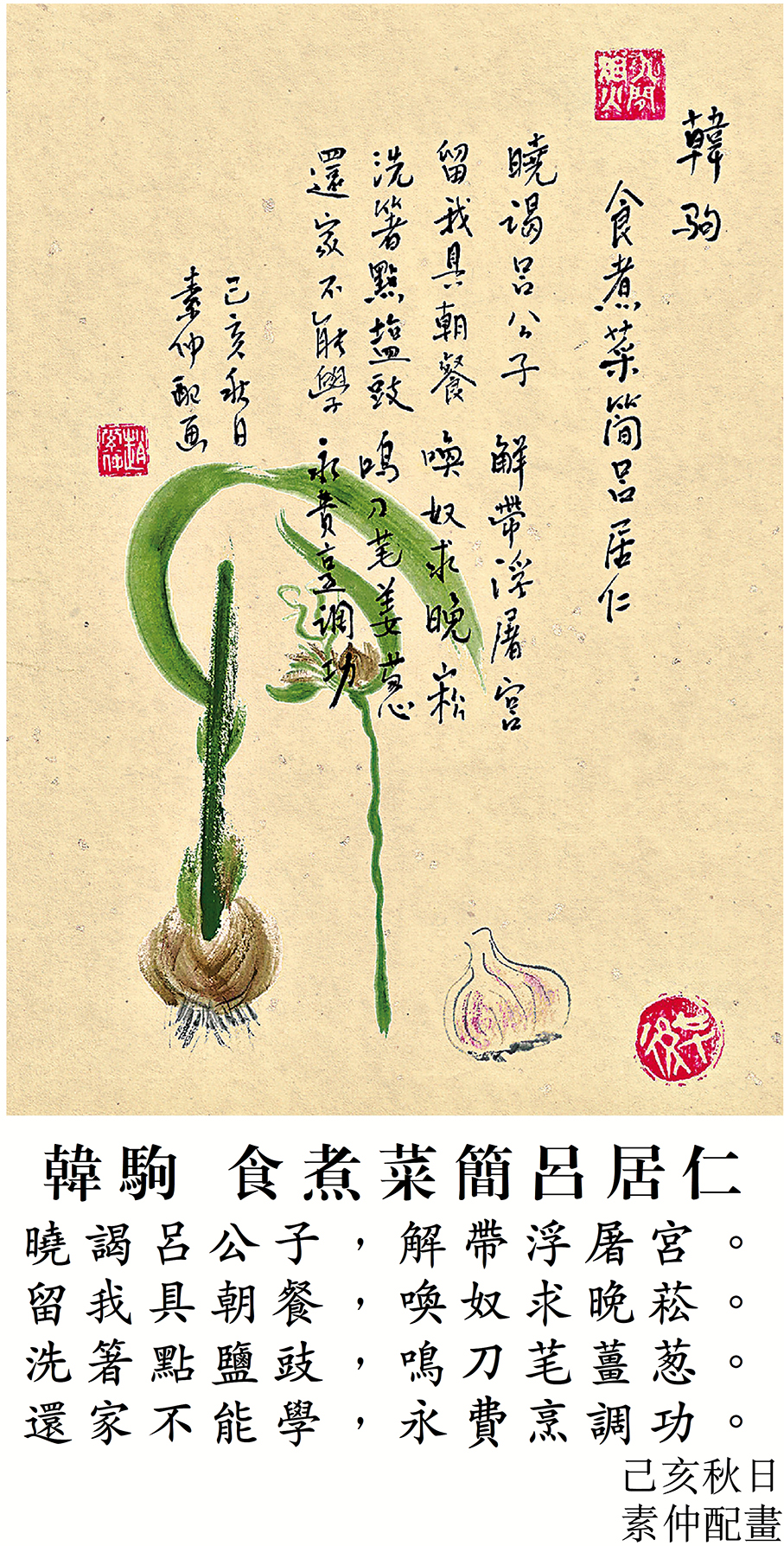 韓駒,字子蒼。少有文采,宋政和中賜進士出身,歷任著作郎、中書舍人等職。獲蘇轍讚賞其詩有儲光羲之風。今日我們把入廚之事稱為「烹飪」或「烹調」,原來把「烹調」作為入廚用以烹製和調味食品的稱謂,是韓駒最早使用的。今日我們說的「烹調達人」或「烹飪專家」原來宋代的韓駒是祖師爺,可說是「烹調之父」了。詩人往訪呂公子,獲招待朝餐。看着廚人的烹製,有薑葱,也要下鹽豉。回家想着自己也下廚烹製,可惜學不來,烹調功夫還得浸淫和累積,經驗最重要。