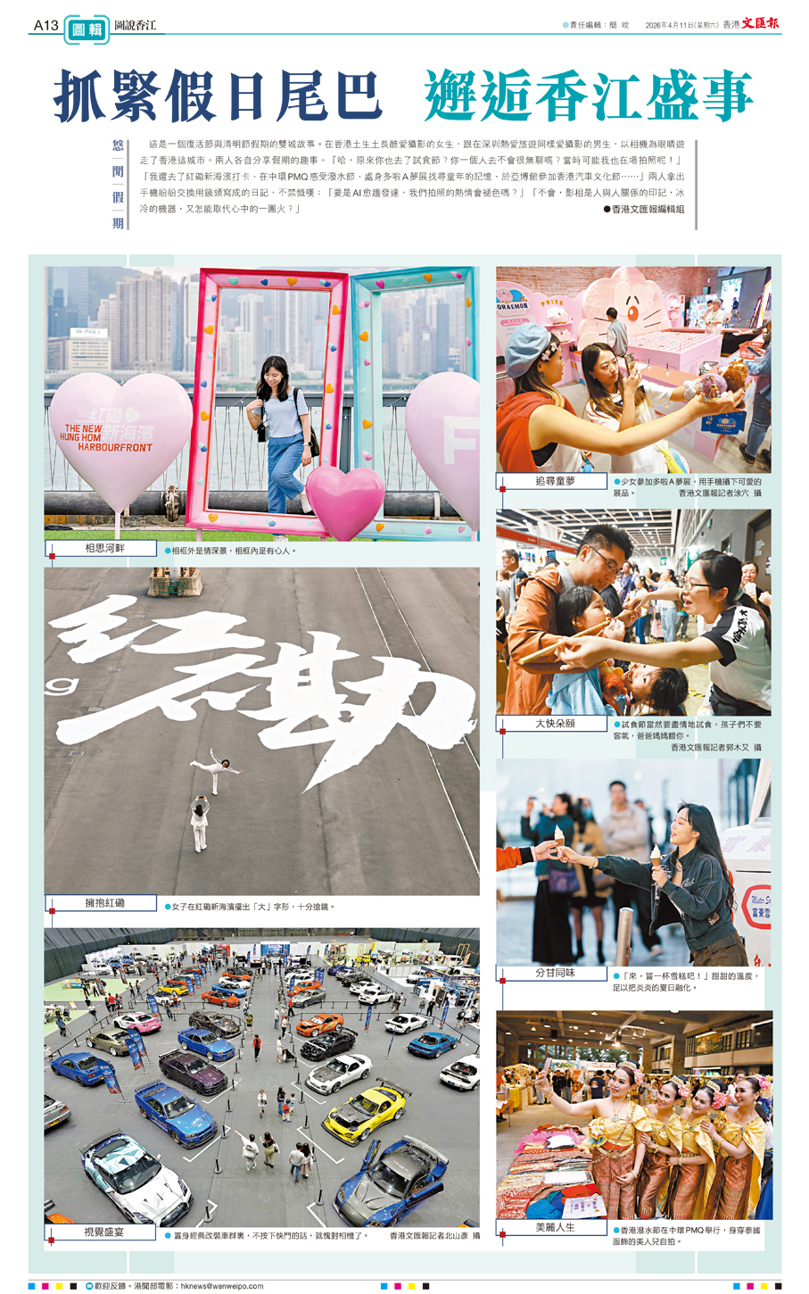 這是一個復活節與清明節假期的雙城故事。在香港土生土長酷愛攝影的女生,跟在深圳熱愛旅遊同樣愛攝影的男生,以相機為眼睛遊走了香港這城市。兩人各自分享假期的趣事。「哈,原來你也去了試食節﹖你一個人去不會很無聊嗎﹖當時可能我也在場拍照呢!」「我還去了紅磡新海濱打卡、在中環PMQ感受潑水節、處身多啦A夢展找尋童年的記憶、於亞博館參加香港汽車文化節……」兩人拿出手機紛紛交換用鏡頭寫成的日記,不禁慨嘆:「要是AI愈趨發達,我們拍照的熱情會褪色嗎﹖」「不會,影相是人與人關係的印記,冰冷的機器,又怎能取代心中的一團火﹖」 ●香港文匯報編輯組
