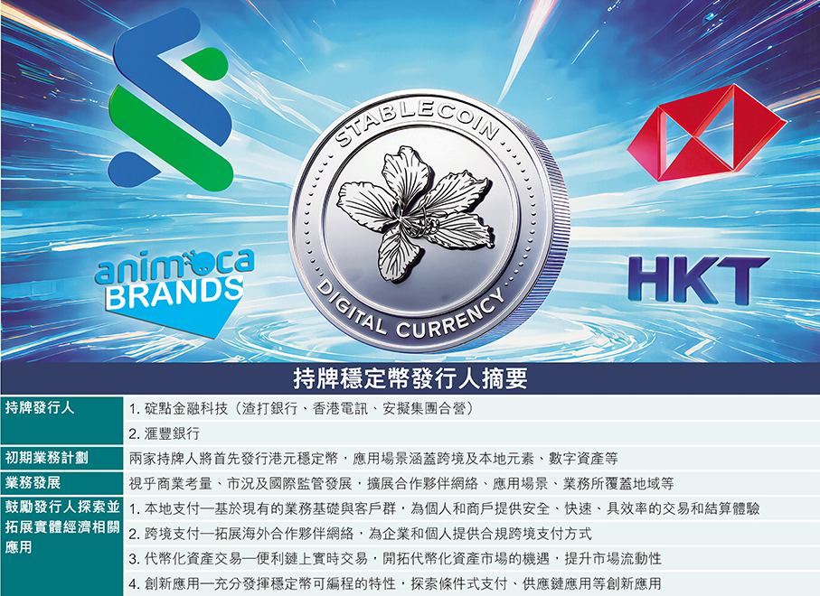 香港金融創新發展踏入新里程碑,自去年5月香港通過《穩定幣條例》至今接近一年,經過香港金管局重重篩選後,首批穩定幣牌照終於落地。金管局昨日宣布,獲發穩定幣發行人牌照的兩間機構分別是滙豐,以及由渣打香港、香港電訊及安擬集團合營的碇點金融,牌照昨日起生效。金管局預期,持牌人今年中至下半年可完成相關準備工作,包括系統測試、落實風險管理措施及人手資源安排,其後便推出穩定幣。滙豐銀行計劃將港元穩定幣無縫接入PayMe和滙豐香港流動理財應用程式(HSBC HK App)。