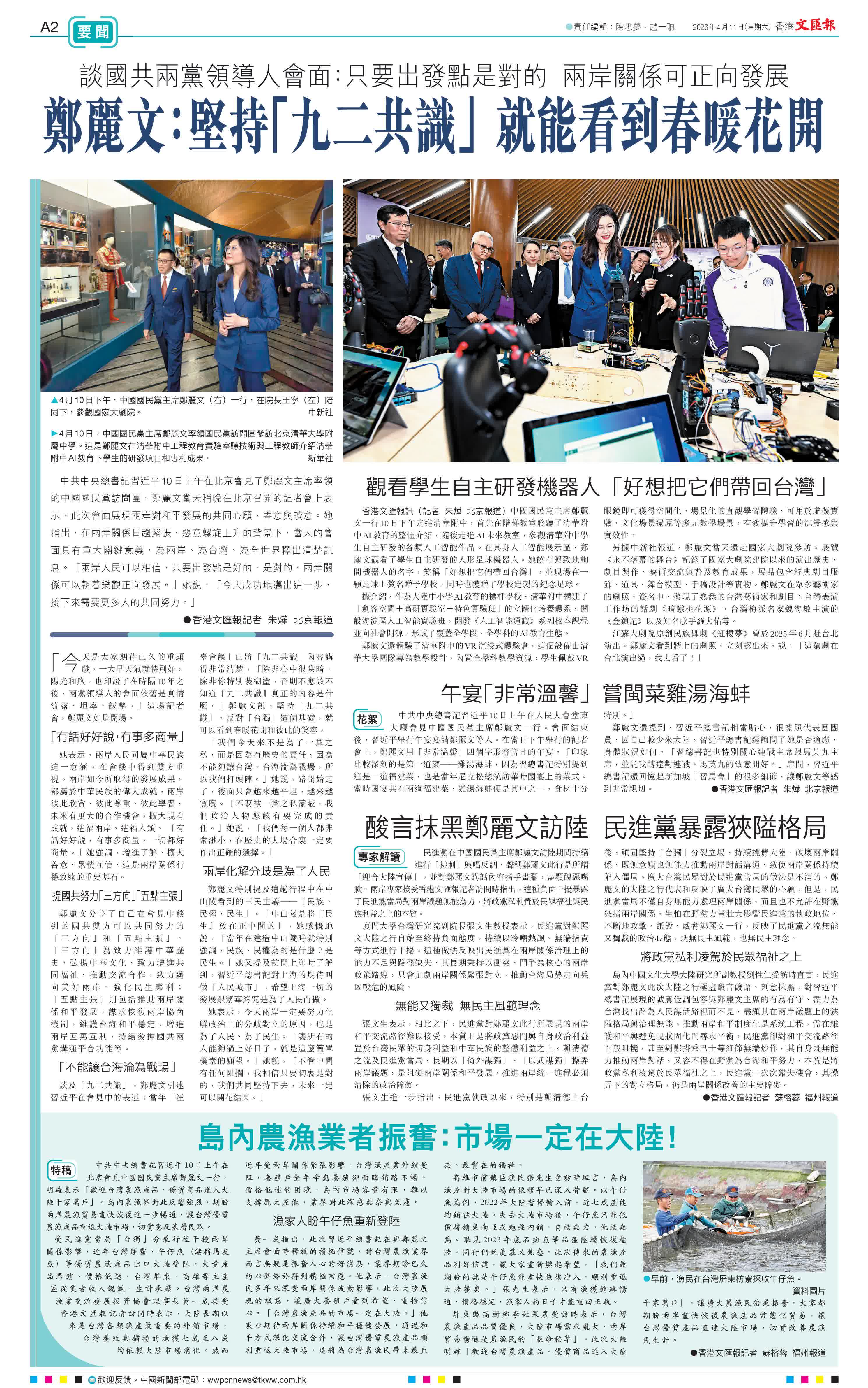 (香港文匯報記者 朱燁 北京報道)中共中央總書記習近平10日上午在北京會見了鄭麗文主席率領的中國國民黨訪問團。鄭麗文當天稍晚在北京召開的記者會上表示,此次會面展現兩岸對和平發展的共同心願、善意與誠意。她指出,在兩岸關係日趨緊張、惡意螺旋上升的背景下,當天的會面具有重大關鍵意義,為兩岸、為台灣、為全世界釋出清楚訊息。「兩岸人民可以相信,只要出發點是好的、是對的,兩岸關係可以朝着樂觀正向發展。」她說,「今天成功地邁出這一步,接下來需要更多人的共同努力。」