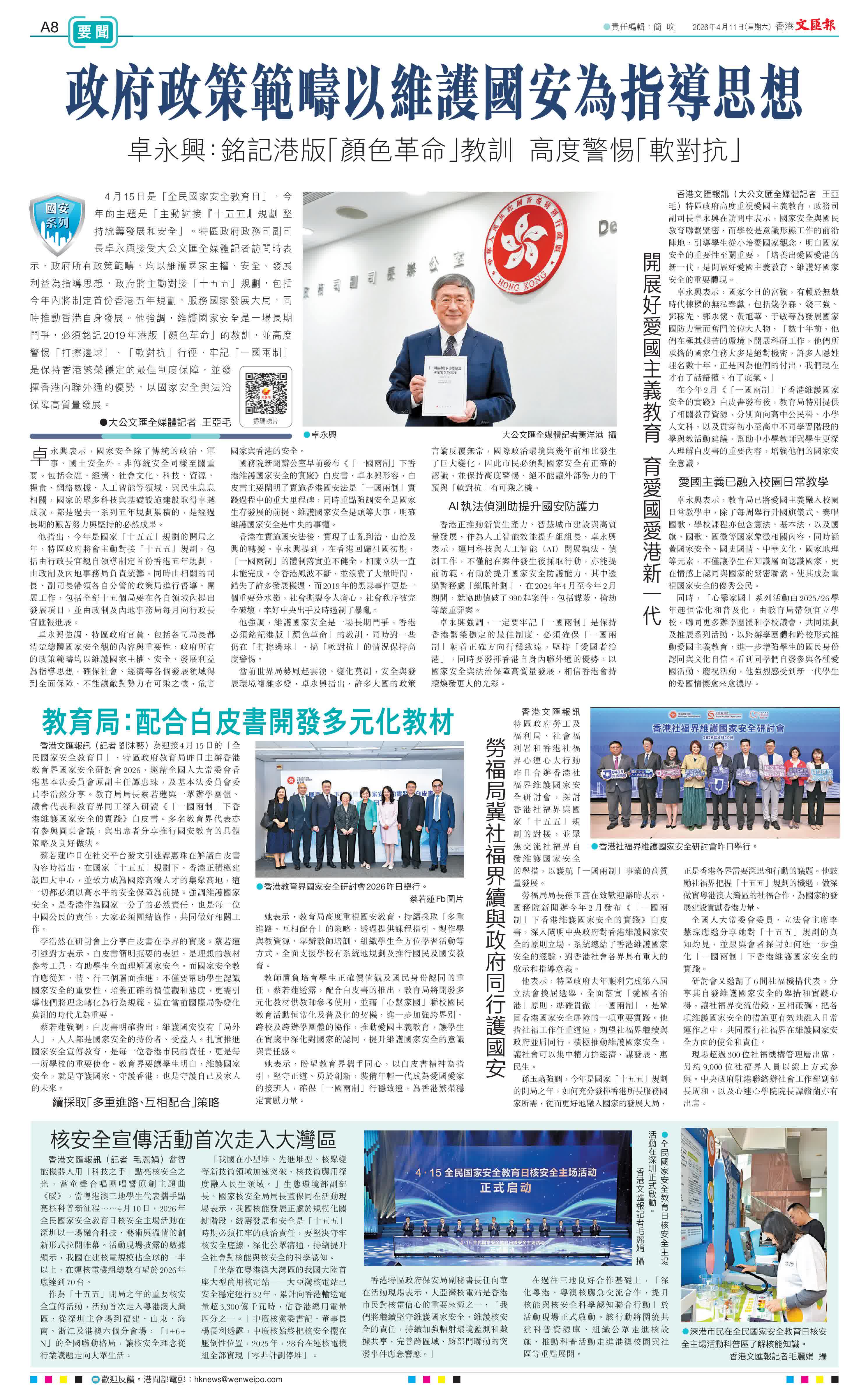 (大公文匯全媒體記者 王亞毛)4月15日是「全民國家安全教育日」,今年的主題是「主動對接『十五五』規劃 堅持統籌發展和安全」。特區政府政務司副司長卓永興接受大公文匯全媒體記者訪問時表示,政府所有政策範疇,均以維護國家主權、安全、發展利益為指導思想,政府將主動對接「十五五」規劃,包括今年內將制定首份香港五年規劃,服務國家發展大局,同時推動香港自身發展。他強調,維護國家安全是一場長期鬥爭,必須銘記2019年港版「顏色革命」的教訓,並高度警惕「打擦邊球」、「軟對抗」行徑,牢記「一國兩制」是保持香港繁榮穩定的最佳制度保障,並發揮香港內聯外通的優勢,以國家安全與法治保障高質量發展。