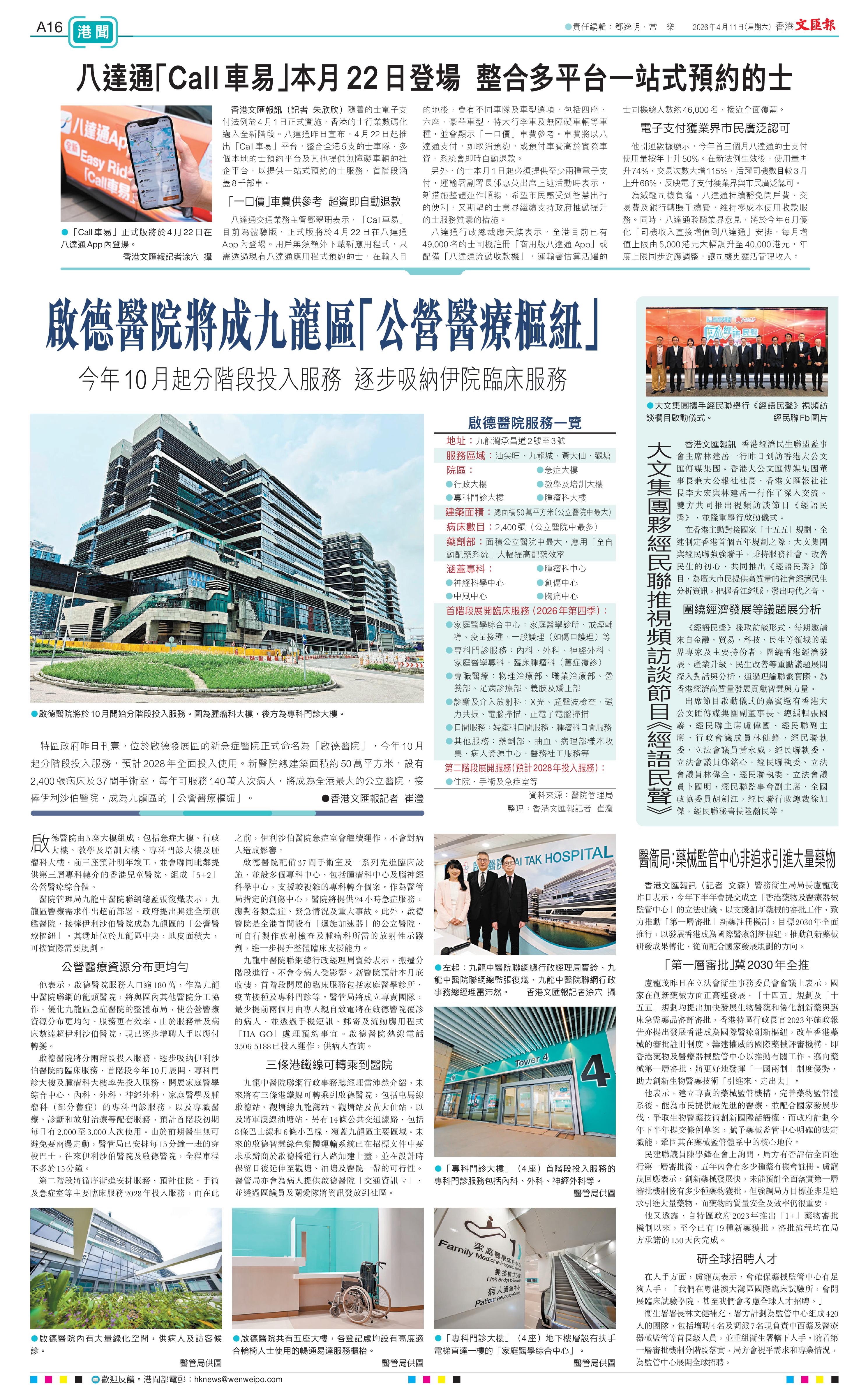 (香港文匯報記者 崔瀅)特區政府昨日刊憲,位於啟德發展區的新急症醫院正式命名為「啟德醫院」,今年10月起分階段投入服務,預計2028年全面投入使用。新醫院總建築面積約50萬平方米,設有2,400張病床及37間手術室,每年可服務140萬人次病人,將成為全港最大的公立醫院,接棒伊利沙伯醫院,成為九龍區的「公營醫療樞紐」。