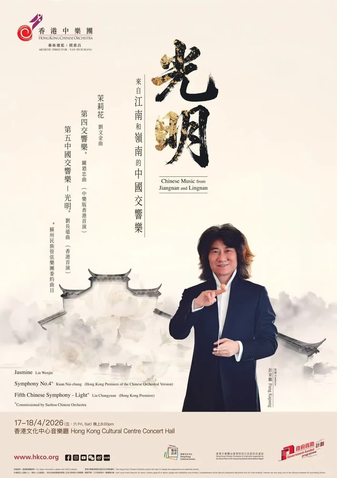 著名指揮家彭家鵬將與香港中樂團首度合作,將於「光明 - 來自江南和嶺南的中國交響樂」音樂會中演繹三部具代表性的民族管弦樂作品,包括劉文金的《茉莉花》、關廼忠的《第四交響樂》以及劉長遠的第五中國交響樂《光明》。