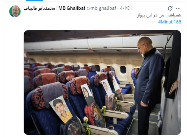 卡利巴夫當天在自己的社交媒體賬號發了一張照片,並配文「我的飛行同伴們」「米納卜168」。照片上的卡利巴夫一身正裝,低頭注視着客艙前排座椅。這些座椅上擺放着的是四名遇難兒童的相片和書包。