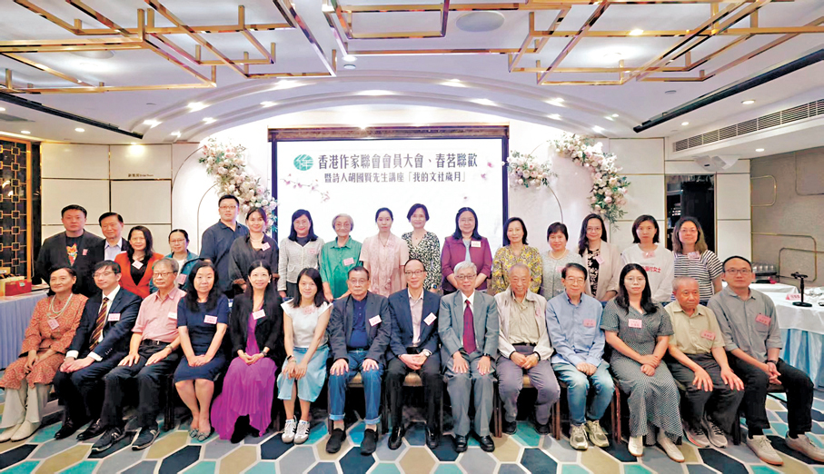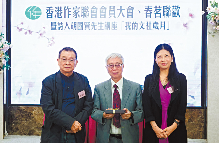 香港作家聯會會員大會、春茗聯歡昨日(11日)舉行,並邀得詩人胡國賢擔任主講嘉賓,帶來講座「我的文社歲月」。出席大會的主要嘉賓包括:中央政府駐港聯絡辦宣文部處長謝李韜,中國文學藝術界聯合會香港會員總會會長、全國人大代表馬逢國,香港著名詩人胡國賢,嶺南大學協理校長李東輝,嗇色園董事會副主席、香港作家聯會顧問律師姚嘉棟,三聯書店(香港)有限公司董事及總編輯于克凌,中華書局(香港)有限公司董事、總經理、總編輯周建華,香港中和出版有限公司總經理兼總編輯陳鳴華,香港中國旅遊出版社社長、《香港文學》社長李國紅,著名作曲作詞人、兒歌之父韋然、黃彩屏伉儷,著名畫家沈平,著名油畫家林鳴崗等等,以及香港作家聯會會長潘耀明,執行會長羅光萍及一眾常務理事、理事。