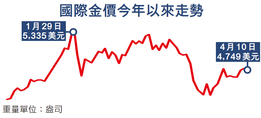 香港文匯報訊(記者 倪巍晨 上海報道)受美伊衝突影響,3月現貨黃金價格一度回落至每盎司4,100.11美元,至月末收報4,667.05美元,全月累跌11.6%。得益於「美伊停火兩周」消息的提振,本月金價逐步止跌回升,上周盤中一度升穿每盎司4,851美元,目前正處於每盎司4,700美元上方。分析指,當前國際地緣政治風險頻發,黃金仍是重要的對沖工具之一。鑒於美國財政赤字居高不下,各國央行購金需求依然暢旺,基準情境下,未來金價有望再創新高,年末或升至每盎司5,900美元水平。