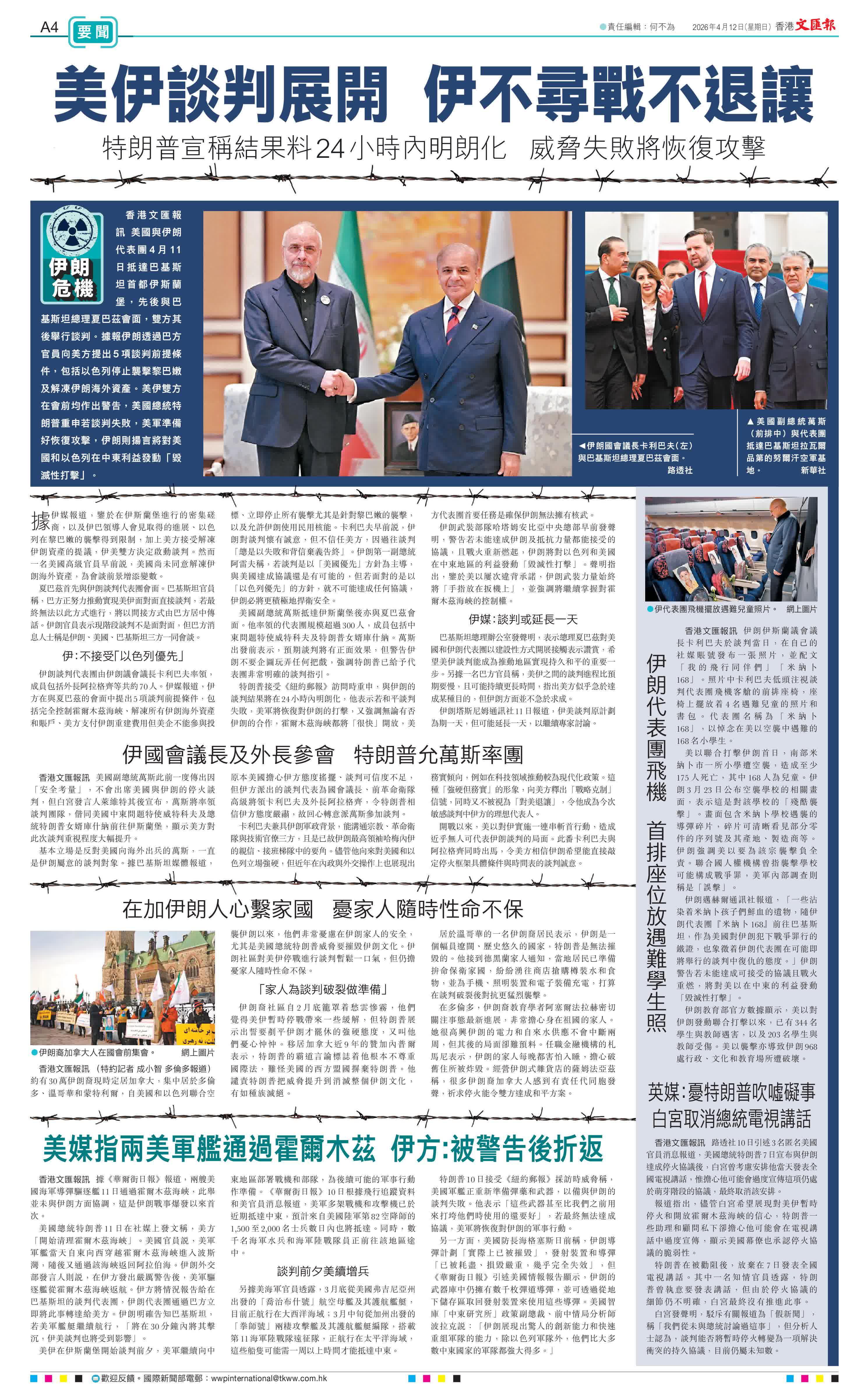 香港文匯報訊 美國與伊朗代表團4月11日抵達巴基斯坦首都伊斯蘭堡,先後與巴基斯坦總理夏巴茲會面,雙方其後舉行談判。據報伊朗透過巴方官員向美方提出5項談判前提條件,包括以色列停止襲擊黎巴嫩及解凍伊朗海外資產。美伊雙方在會前均作出警告,美國總統特朗普重申若談判失敗,美軍準備好恢復攻擊,伊朗則揚言將對美國和以色列在中東利益發動「毀滅性打擊」。