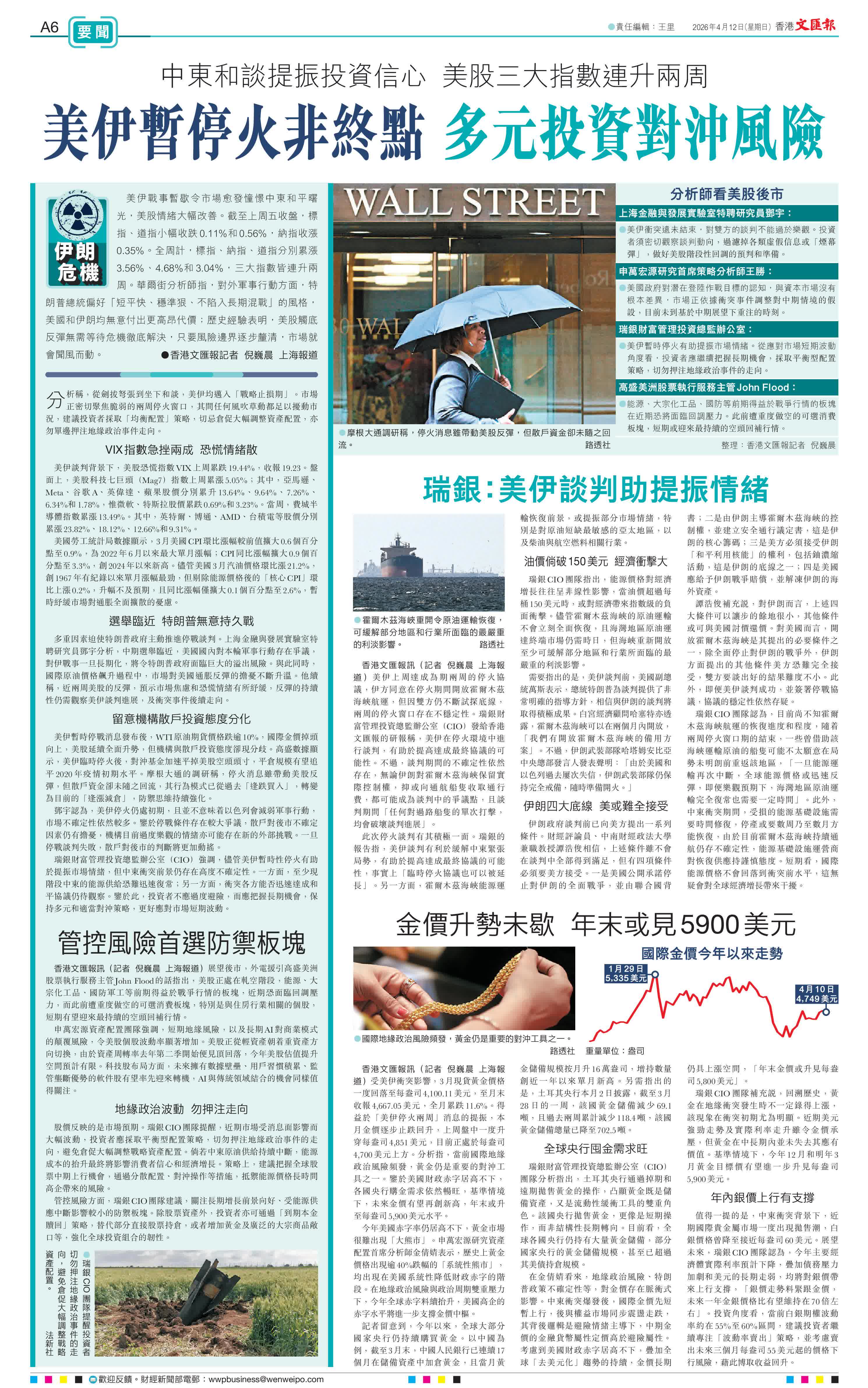 (香港文匯報記者 倪巍晨 上海報道)美伊戰事暫歇令市場愈發憧憬中東和平曙光,美股情緒大幅改善。截至上周五收盤,標指、道指小幅收跌0.11%和0.56%,納指收漲0.35%。全周計,標指、納指、道指分別累漲3.56%、4.68%和3.04%,三大指數皆連升兩周。華爾街分析師指,對外軍事行動方面,特朗普總統偏好「短平快、穩準狠、不陷入長期混戰」的風格,美國和伊朗均無意付出更高昂代價;歷史經驗表明,美股觸底反彈無需等待危機徹底解決,只要風險邊界逐步釐清,市場就會聞風而動。