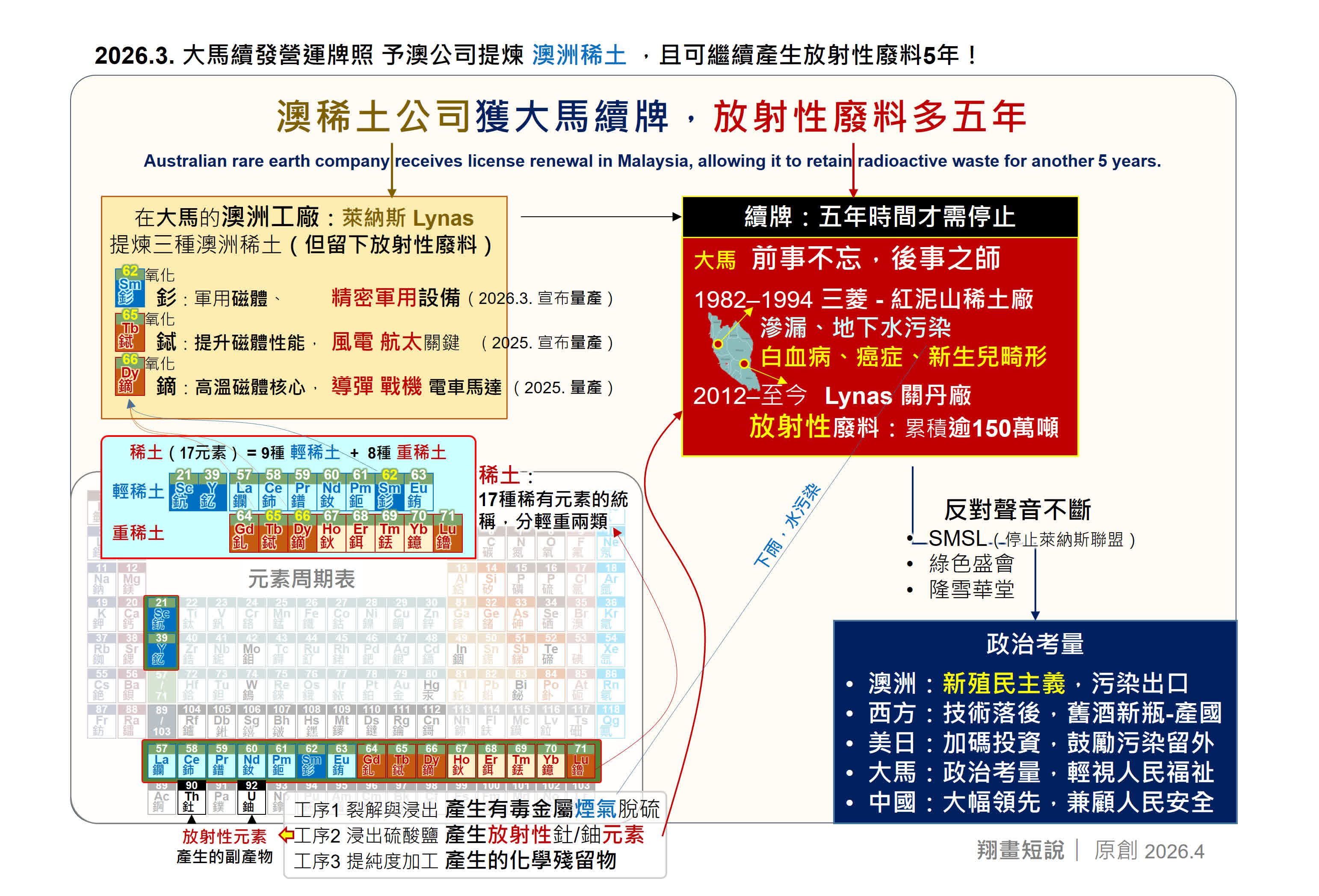 正當此時,澳洲萊納斯(Lynas)獲馬來西亞續發十年營運牌照,並獲得五年緩衝期處理放射性廢料。西方輿論隨即高調宣稱這是「打破壟斷」的技術突破,然而光環背後的真相比宣傳更為複雜。馬來西亞承接西方本土已無法容納的污染工序,在當今全球嚴格環保標準下,世上罕見。