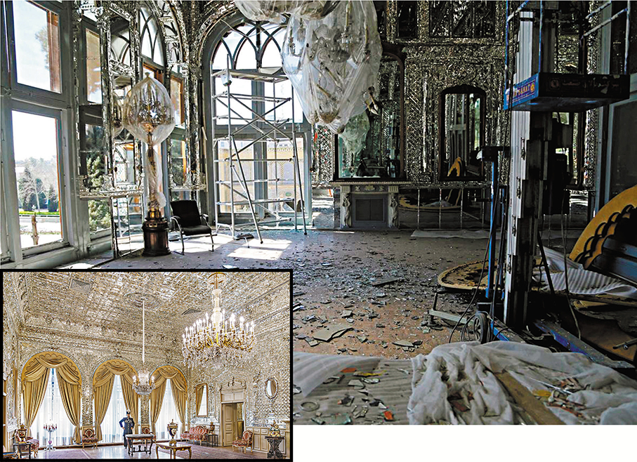 作為德黑蘭最古老的建築群、2013年列入世界遺產的卡扎爾王朝皇家宮殿,其核心景觀鏡廳遭毀滅性衝擊——數萬片手工鑲嵌的鏡面玻璃被衝擊波震碎,天花板大面積剝落坍塌,水晶吊燈墜落粉碎,彩色玻璃窗、雕花木門與大理石基座全部開裂破損。