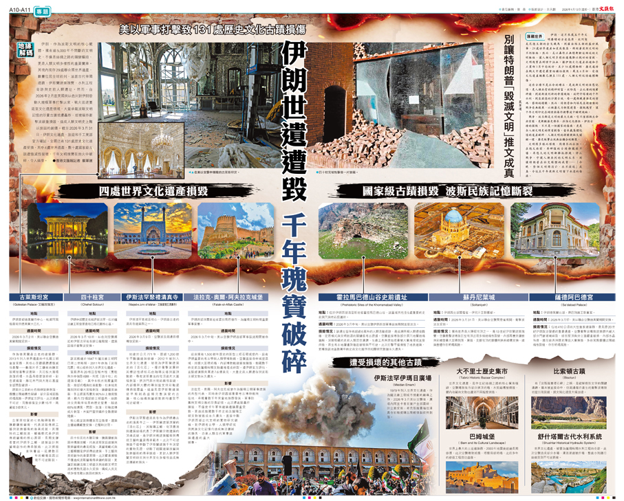 伊朗,作為波斯文明的核心載體,擁有逾5,000年不間斷的文明史,不僅是絲綢之路的關鍵樞紐,更是人類文明多樣性的重要寶庫。其境內現存29處聯合國世界遺產,數量位居全球前列,涵蓋古代帝國遺蹟、伊斯蘭建築瑰寶、水利工程奇跡與史前人類遺址。然而,自2026年2月底美國與以色列對伊朗發動大規模軍事打擊以來,戰火迅速蔓延至文化遺產領域,大量承載波斯文明記憶的珍貴古蹟或遭轟炸,或被爆炸衝擊波嚴重損毀,造成人類文明史上難以挽回的創傷。截至2026年3月31日,伊朗文化遺產、旅遊和手工業部官方確認,全國已有131處歷史文化遺產受損,其中4處世界遺產、數十處國家級古蹟遭毀滅性破壞,千年文明瑰寶在炮火中破碎,令人痛惜。 ●香港文匯報記者 裴軍運