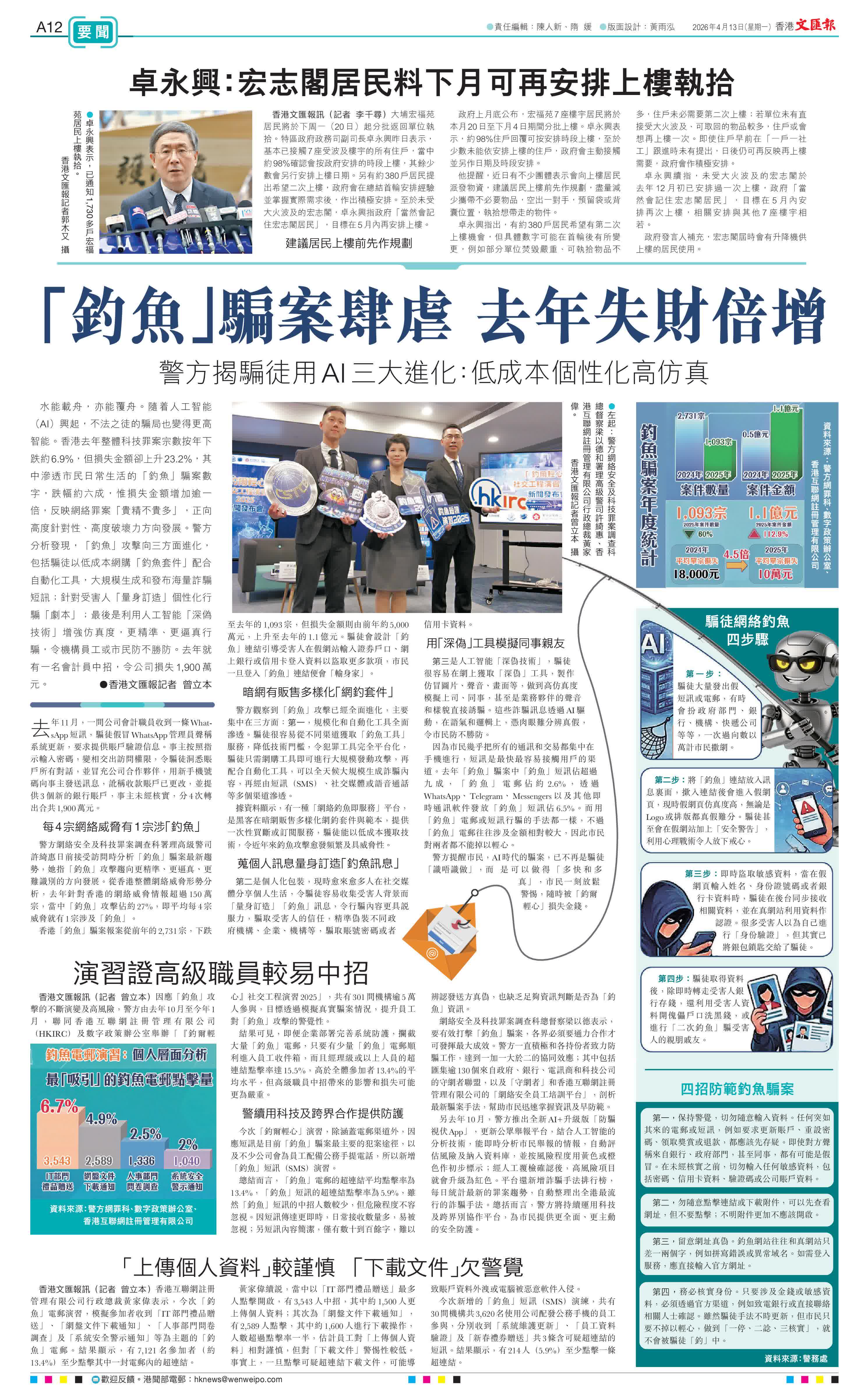 (香港文匯報記者 曾立本)水能載舟,亦能覆舟。隨着人工智能(AI)興起,不法之徒的騙局也變得更高智能。香港去年整體科技罪案宗數按年下跌約6.9%,但損失金額卻上升23.2%,其中滲透市民日常生活的「釣魚」騙案數字,跌幅約六成,惟損失金額增加逾一倍,反映網絡罪案「貴精不貴多」,正向高度針對性、高度破壞力方向發展。警方分析發現,「釣魚」攻擊向三方面進化,包括騙徒以低成本網購「釣魚套件」配合自動化工具,大規模生成和發布海量詐騙短訊;針對受害人「量身訂造」個性化行騙「劇本」;最後是利用人工智能「深偽技術」增強仿真度,更精準、更逼真行騙,令機構員工或市民防不勝防。去年就有一名會計員中招,令公司損失1,900萬元。